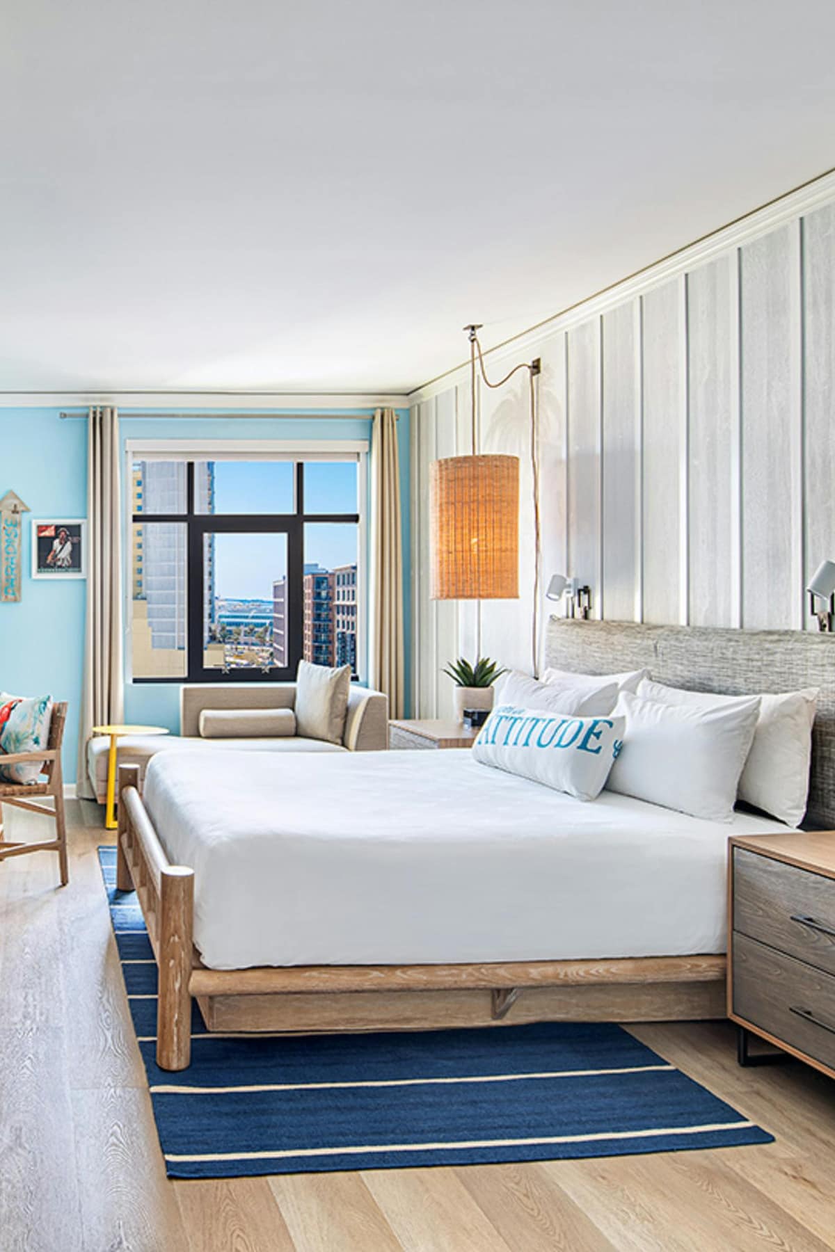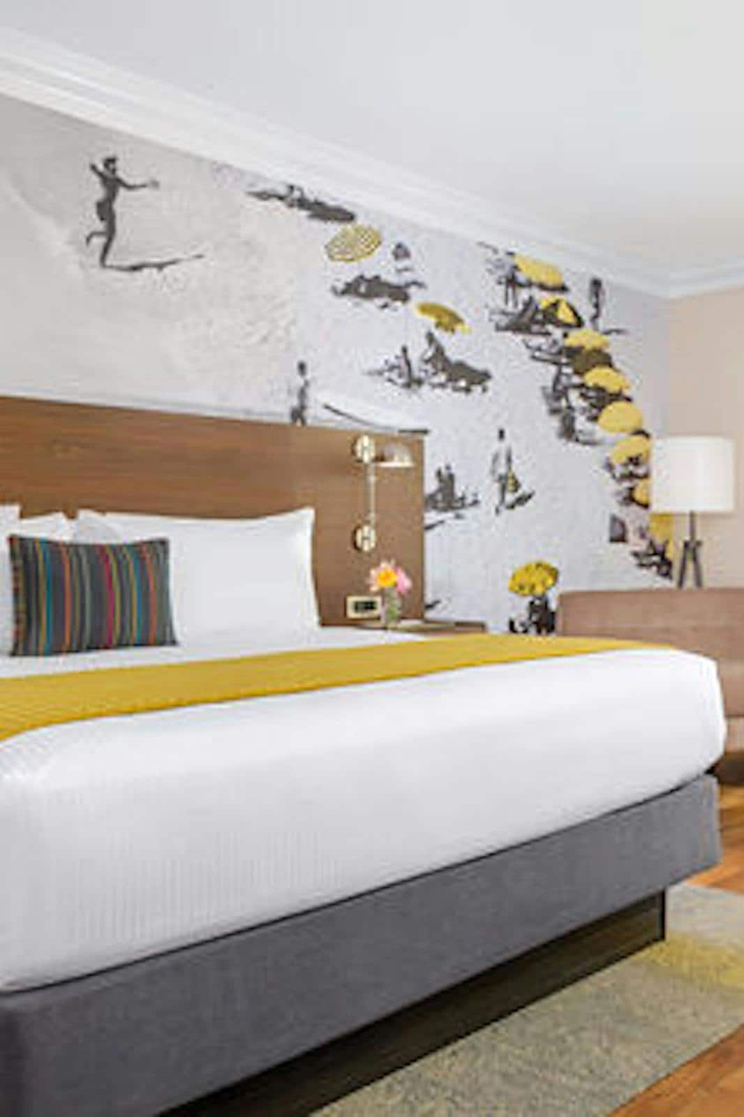 Enjoy the expansive comfort of a king-size bed in the Z King room, perfect for sharing or stretching out solo. Stream your favorite shows on the 43" HDTV with high-speed WiFi, and unwind in European-style double duvets, oversized towels, and micro-fiber bathrobes. Indulge in Tommy Bahama bath products and start your day with unlimited Keurig coffee and bottled water. This room blends playful luxury and relaxing amenities for a truly memorable stay.