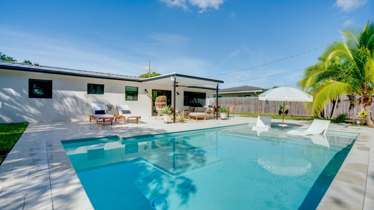 Esta LUJOSA y LIMPIA casa de 3 dormitorios y 3 baños con piscina climatizada + bar exterior + cabaña Tiki está a 20 minutos en coche del aeropuerto de Fort Lauderdale y a 10 minutos de la playa. ¡A 700 pies de más de 10 restaurantes y varias tiendas de comestibles! ¡Nuestra casa tiene todo lo que necesitas al alcance de la mano! Los servicios también incluyen: cafetera de cortesía, cocina totalmente equipada, televisores inteligentes 4K de 70 pulgadas con HULU, NETFLIX, Disney+ GRATIS, sillas de playa/salón y cómodas camas de alta gama con COLCHÓN SERTA NUEVO y muebles nuevos de calidad.