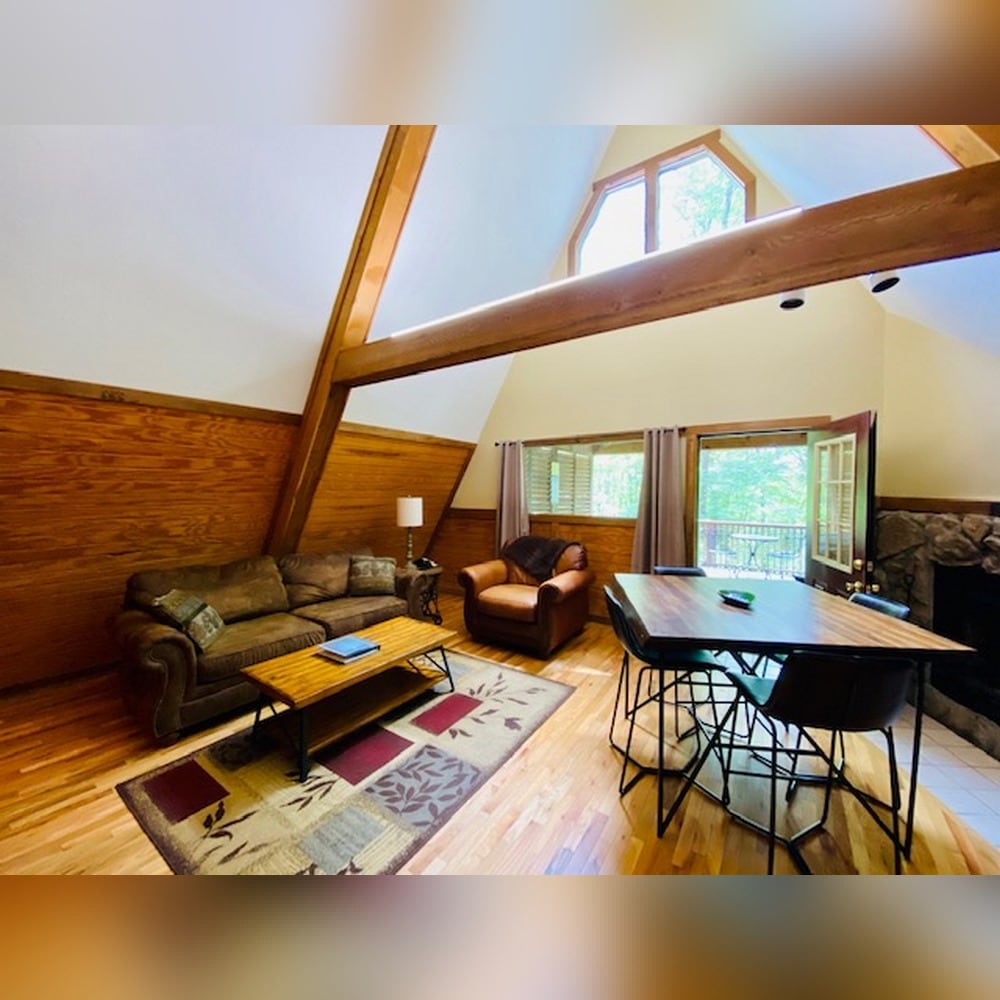 Las emblemáticas cabañas A-Frame son románticas, acogedoras y cómodas, ¡para un máximo de cuatro personas y dos mascotas! Los chalets A-Frames se encuentran a lo largo de la cresta de una colina, con vistas boscosas privadas desde cada una de las terrazas traseras y las bañeras de hidromasaje. Este tiene un patio trasero con chimenea privada. Una reina y un baño completo en el primer piso, junto con la chimenea, la sala de estar y la cocina pequeña. Una segunda cama de dos plazas en un loft abierto bajo las vigas rústicas expuestas.