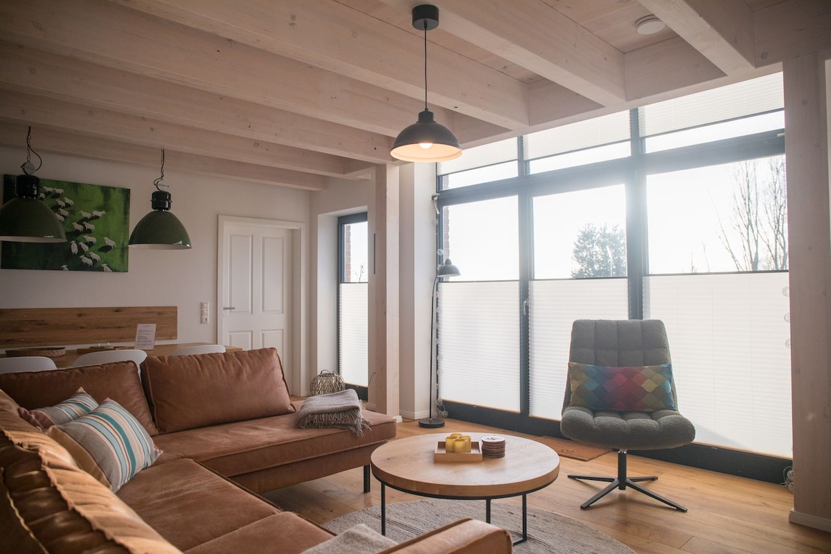 Loft del Mar del Norte. Fedderwardersiel. Mar del Norte Loft del Mar del Norte Fedderwardersiel: a solo unos pasos de la pintoresca costa del Mar del Norte. Ya sea maravillosos días de verano o tormentosos: relájate con relajantes noches de sauna, acomódate con un libro en el sofá o en la tumbona de jardín. El loft ofrece un amplio espacio para toda la familia. Descubre el encantador puerto cortador o disfruta de una copa de vino en la terraza en paz: déjate llevar