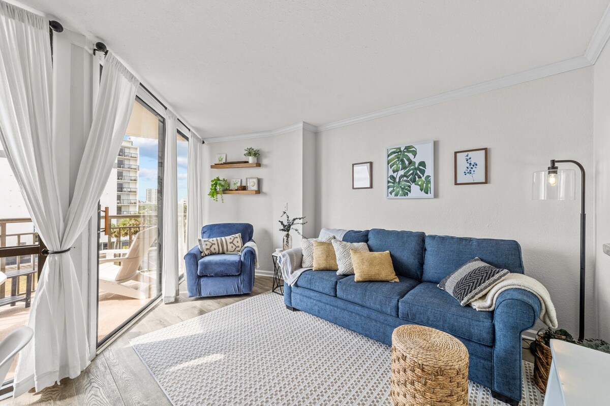 Despiértate con impresionantes vistas del Atlántico y del interior y de la puesta de sol desde tu balcón privado. Totalmente renovado con una moderna decoración costera, Smart TV y cómodas camas. A pocos pasos de la playa, el paseo marítimo y SkyWheel. Disfruta de ríos lentos, piscinas, jacuzzis, bar tiki y Starbucks en el hotel. ¡Escapada romántica o familiar perfecta en el corazón de Myrtle Beach! Aparcamiento y wifi gratis. ¡Reserva ahora!