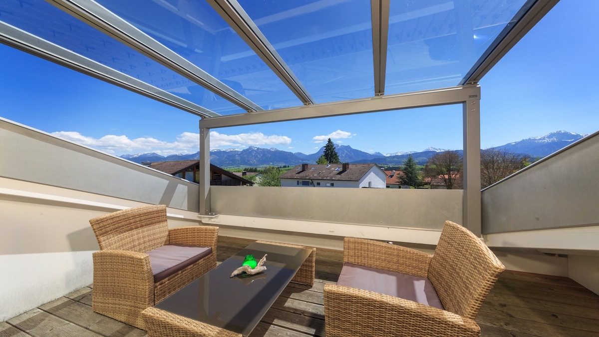pura.relajación - ¡Deja que tu alma cuelgue, respira el aire fresco de la montaña, siente la naturaleza bajo tus pies, simplemente sé! El luminoso apartamento ofrece unas vistas espectaculares de los Alpes y del castillo de Neuschwanstein desde dos balcones. Se encuentra justo al lado del lago Forggensee (embalse). El luminoso apartamento tiene unos 100 metros cuadrados. Los dos balcones de tamaño generoso ofrecen impresionantes vistas de los Alpes, así como del famoso castillo de Neuschwanstein. Se encuentra justo al lado de la presa Forggensee.