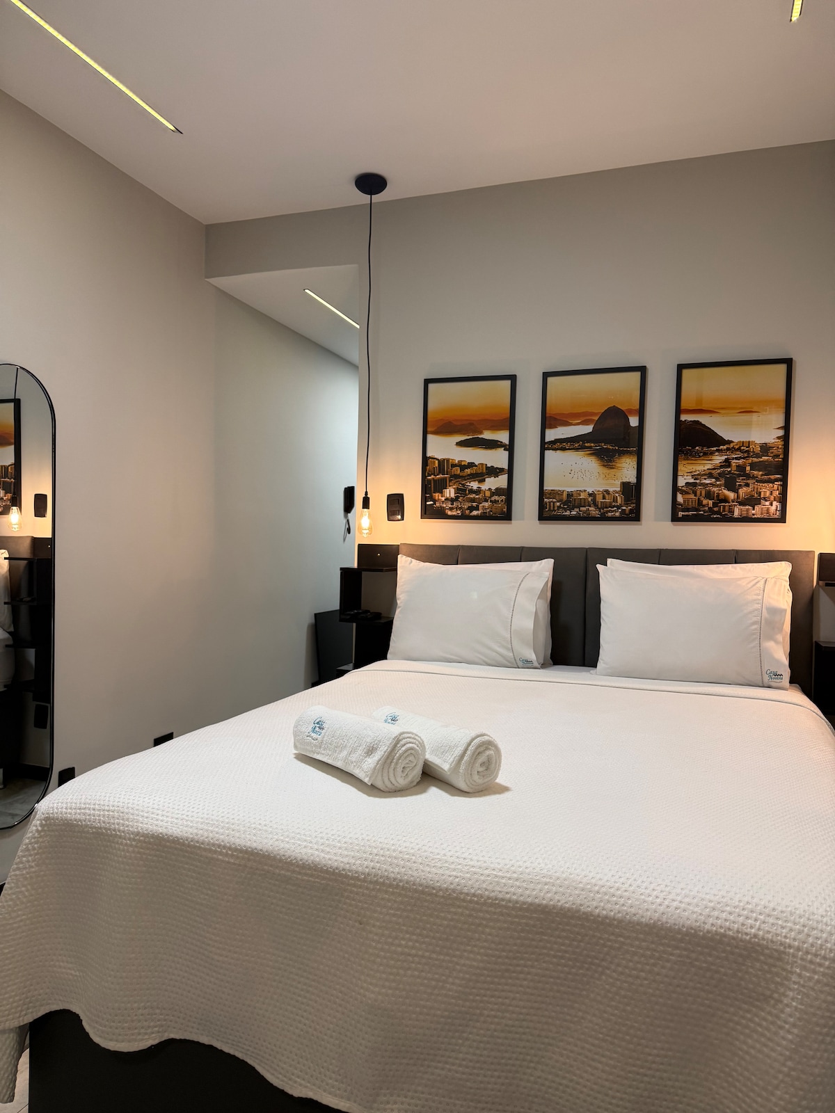 Siente la bossa nova con la brisa del mar en CASA JOBIM, y disfruta de toda la experiencia y comodidad de estar en un apartamento de diseño conceptual en Copacabana, donde la inspiración se encuentra con la belleza de Río de Janeiro. Estamos ubicados en el Real Residence Hotel, que ofrece todas las comodidades para una estancia elegante y agradable. Ofrecemos servicio de limpieza, Wi-Fi de 500 MB, TV por cable, Netflix y aire acondicionado y espacio de coworking a tres cuadras de la playa. Opción de dos camas individuales o una cama queen.