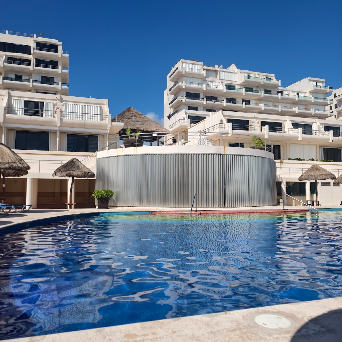 This recently renovated apartment has stunning views of the Ocean and Pool area. It has two queen size beds, and a kitchenette with all the essentials (Portable stove top, Microwave, Drip coffee maker, etc.) We have good internet, and a very nice balcony. Free guarded parking. we are 17 min from the airport. Condo has a huge pool, with a large children's area, beach lounge chairs, a restaurant on the beach, convenient store and coin laundry. Located in Cancun Plaza.
