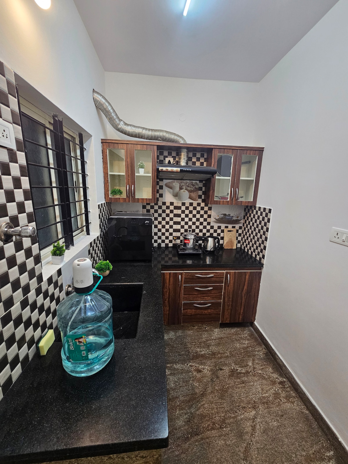 Living Area - Elegant wooden sofa, Coffee table and rugs for a cozy vibe, Warm lighting for a relaxing ambiance Bedroom - Comfortable queen-size bed, fresh linens, ambient bedside lighting, Large wardrobe, Cozy full view mirrors Kitchen - Induction, utensils, kettle, and cookware.Ideal for light cooking and daily meals for long stays Bathroom - Geyser, European toilet, Mirror, Wash basin, Shampoo, Shower gel, Towels. Amenities - Washing machine, Fridge, high speed Wifi, Study/work table.