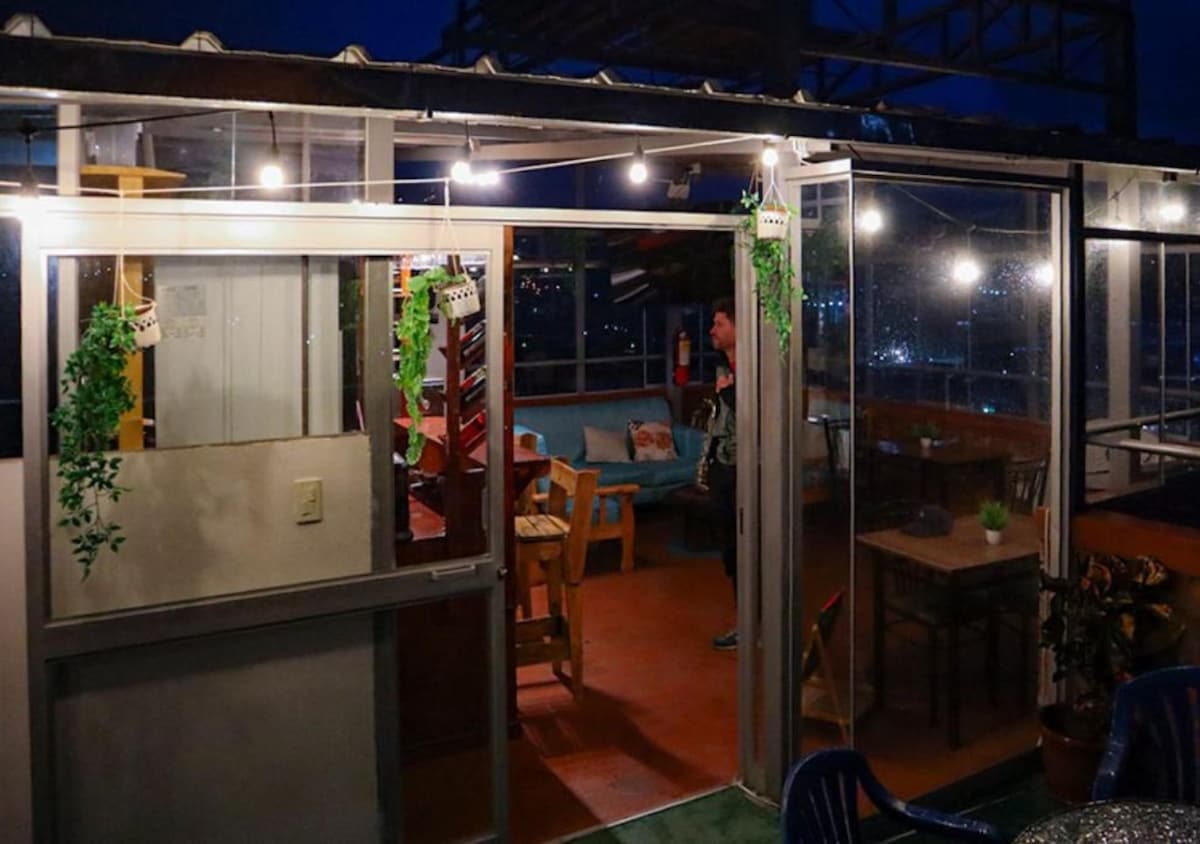 Habitación matrimonial espaciosa con una cama de 3 plazas y vista a las montañas, disfruta de este acogedor espacio con acabados de madera que lo hacen acogedor y perfecto para el frío de la ciudad, el hotel tiene espacios compartidos como cocina, sala de lectura, patio y lockers para guardar sus cosas.