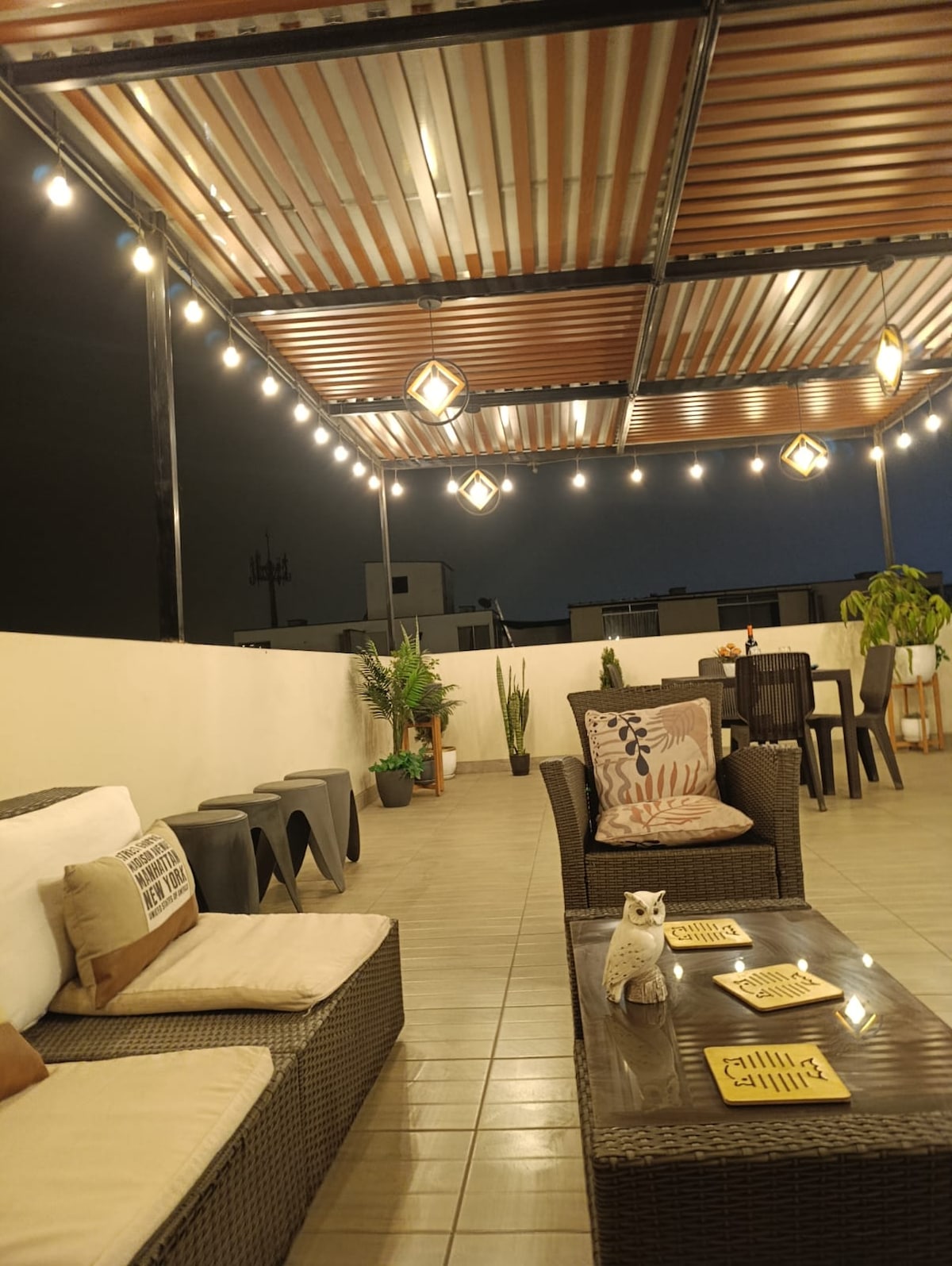 Depa con excelente ubicación, tranquilo, muy bien ventilado e iluminado. Frontis vista a la calle villa del mar que baja perpendicular al depa. Parte posterior mira al parque principal y a un costado canchas de fronton y parque. Dormitorio cama queen y tv smart 45", dormitorio 2 cama dos plazas plegable y camarote plaza y media. Dos baños completos. Terraza comedor exterior. Terraza 2 hamaca. Sala tv smart 65", equipo stereo y Alexa (música, lamparas y luz terraza) Comedor, Cocina, lavanderia