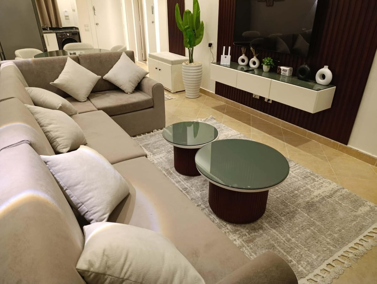 Disfruta con toda la familia en esta elegante residencia, que consta de dos dormitorios y una recepción con una maravillosa vista al mar y una piscina, donde puedes ver el mar durmiendo en la cama muy cómoda o en el sofá en la recepción, la calma con la belleza de la vista es una cosa importante que te hace disfrutar de tu tiempo, y también puedes relajarte en el balcón del apartamento donde se emite una luz solar saludable desde el amanecer hasta el atardecer, y también puedes relajarte en la piscina en el suelo.