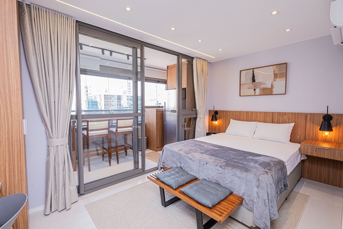 Um Refúgio em Moema — Com Mezanino e Pôr do Sol! Bem-vindo ao seu novo lugar favorito em São Paulo. Este Studio foi projetado para quem aprecia conforto, e uma atmosfera acolhedora. A luz natural invade o espaço ao fim da tarde, criando um cenário perfeito para relaxar e apreciar uma vista ampla iluminada pelo pôr do sol e experiência única. Desfrute desse espaço novíssimo e elegante! Seja em viagens a trabalho, estudo, lazer ou uma estadia romântica.