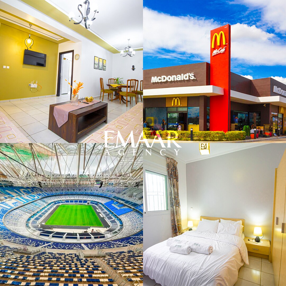 Je vous présente un magnifique appartement situé à Tanger, offrant une vue imprenable sur le Grand Stade et la cité sportive. - Les arrêts de bus et de taxi sont facilement accessibles, facilitant vos déplacements en ville. - À seulement 15 minutes de la corniche et du centre-ville, vous pourrez profiter des plages et des activités urbaines en un rien de temps. Cet appartement est un véritable havre de paix, offrant à la fois confort, commodité, et une localisation stratégique.