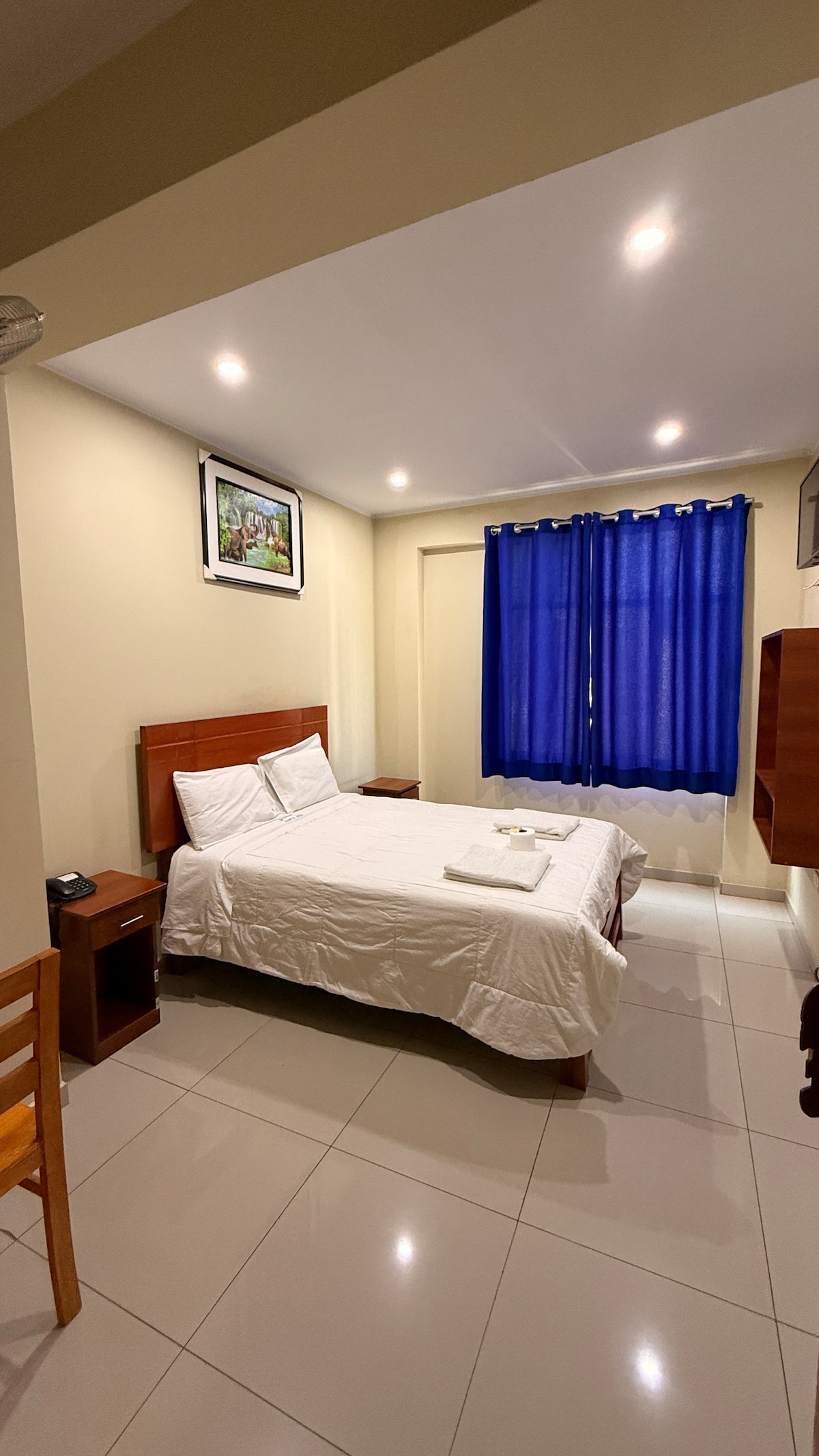 Nuevo Hotel con 22 hab, más de 2100 m2 de área construida, 2000 m2 de área social. 2 piscinas, estacionamientos exclusivos. Ascensores, ser de wifi, direc tv, netflix, prime, disney. Terrazas en el primer piso y 4to piso. Hab familiares amplias, hab matrimoniales, todas con baño incluido, kit de baño. Tv de 55". Colchones de la marca Rosen modelo Neo 2024 en king size y queen. Esta es una pequeña hab, con cama queen, Tv de 50" y baño propio. No tiene ventanas, pero cuenta con A/C.