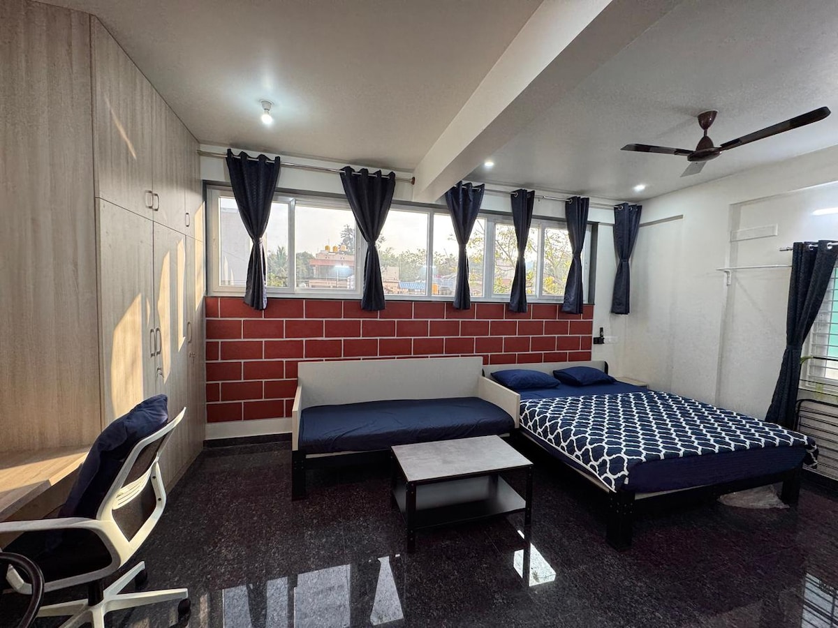 ¡Bienvenido a nuestro apartamento de servicio premium céntrico en Mysore! Perfecto para viajeros, familias y profesionales que trabajan, nuestro hogar te brinda fácil acceso a todo lo que Mysore tiene para ofrecer. LO más destacable DE LA ubicación A 0,5 km de la estación de tren de Mysore A 2,5 km del Palacio de Mysore A 3,0 km de la estación de autobuses de Mysore Rodeado de los mejores restaurantes, cafeterías y tiendas locales de la ciudad Tanto si estás aquí para hacer turismo, para ir de compras o simplemente para una escapada relajante, nuestra estancia te garantiza comodidad y conveniencia.