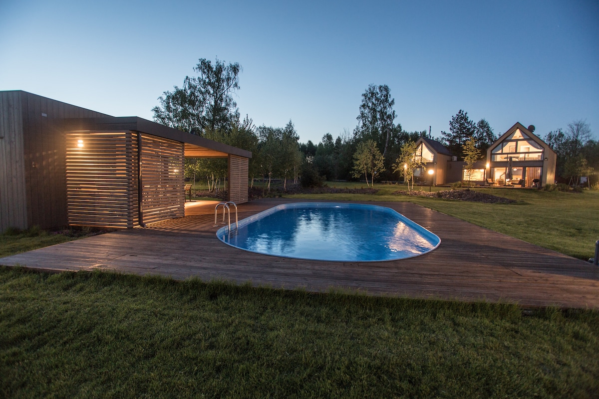 Bienvenido a una de nuestras 6 casas: la casa DEL BOSQUE. Esto es parte del complejo que creamos con 2 piscinas, una gran área común, un parque infantil. La casa tiene 4 dormitorios, sala de estar, comedor, cocina bien equipada, 2 baños y 2 terrazas. Será cómodo para 8-10 personas, para familias con niños pequeños puede alojar a unas 12 personas. Hay bosques, lagos, senderos y senderos cercanos. El lugar tiene su propio ambiente único y ya ha ganado muchos fanáticos leales y leales. Es ideal para escapadas familiares.
