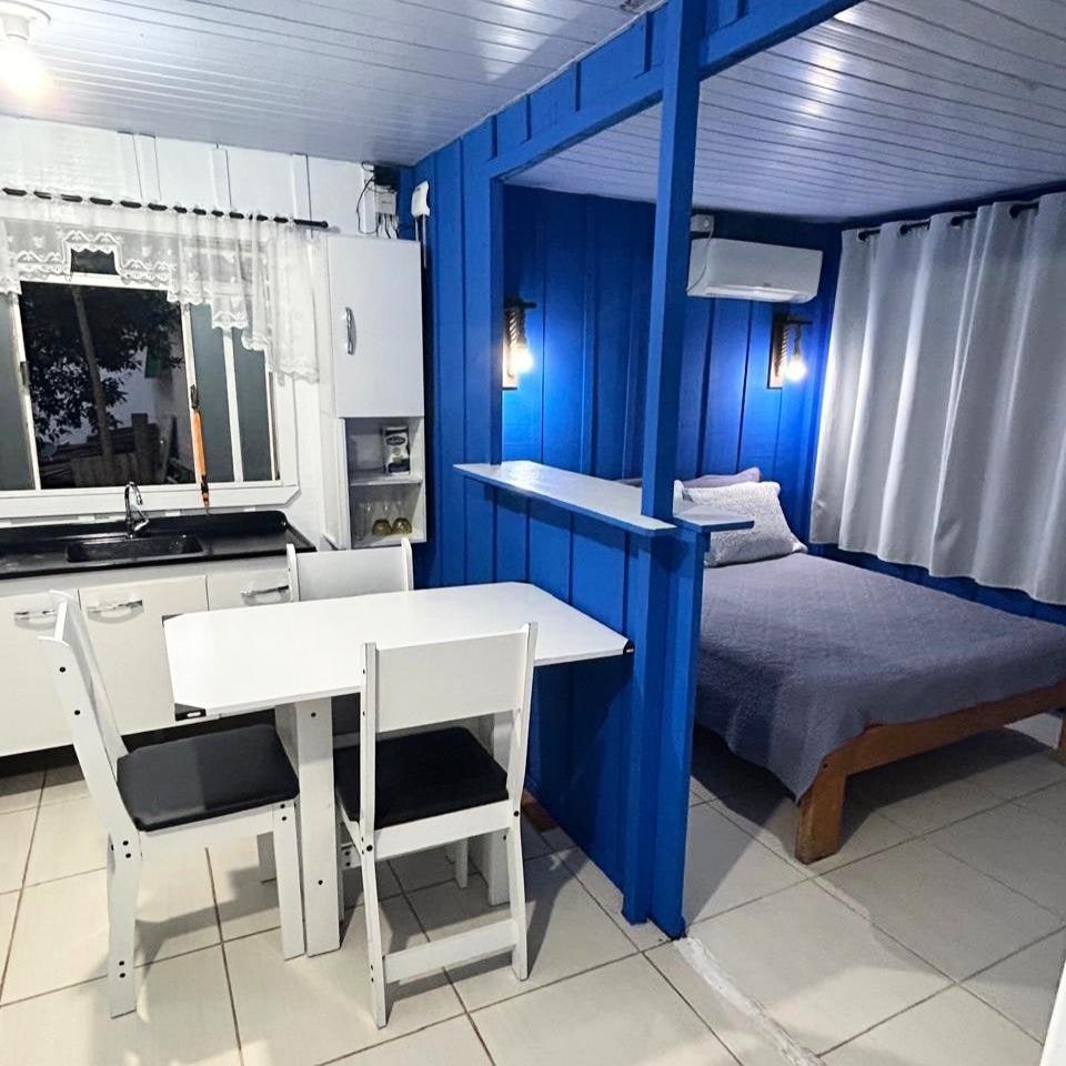Este hermoso ESTUDIO, ideal para dos (2) personas y con capacidad para cuatro (4) personas, tiene: * Bagada con barbacoa; * Casillero de ropa; * Cama doble + colchón; * Dois Puffs + Colchonete; * Lavadora; * Estante con panel y televisor inteligente; * Wifi incluido; * Fogão; * Horno microondas; * Aire acondicionado; * Secador de pelo; * Plancha de la ropa; * Licuadora; * Assadeira; * Hervidor eléctrico *Mesa cerrada para 2 personas y abierta para 4 personas.