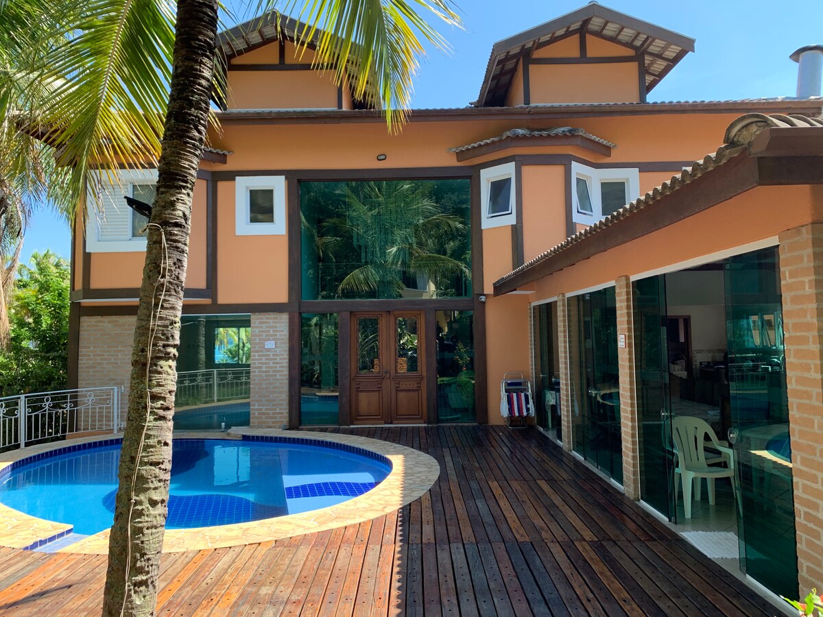 ¡Esta casa es un pequeño paraíso! Situado en el condominio Ponta da Sela, con pista de tenis, campo de fútbol y un muelle para el mar y la pesca. Tiene capacidad para 15 personas. Casa amarilla: 4 suites con aire acondicionado y 1 habitación de apoyo con ventilador. Casa balinesa: 1 dormitorio con aire acondicionado y 1 con ventilador. Espacio gourmet con barbacoa, horno de pizza, estufa, piscina y jacuzzi climatizado. También cuenta con un espacio infantil, una zona zen, una chimenea, salas de estar, un comedor y TV, una cocina equipada, wifi, una Smart TV y canales por cable. ¡Se admiten mascotas!