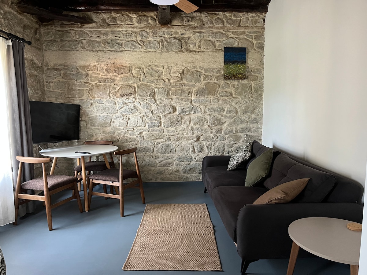 Casa de piedra 1+1 con balcón grande.