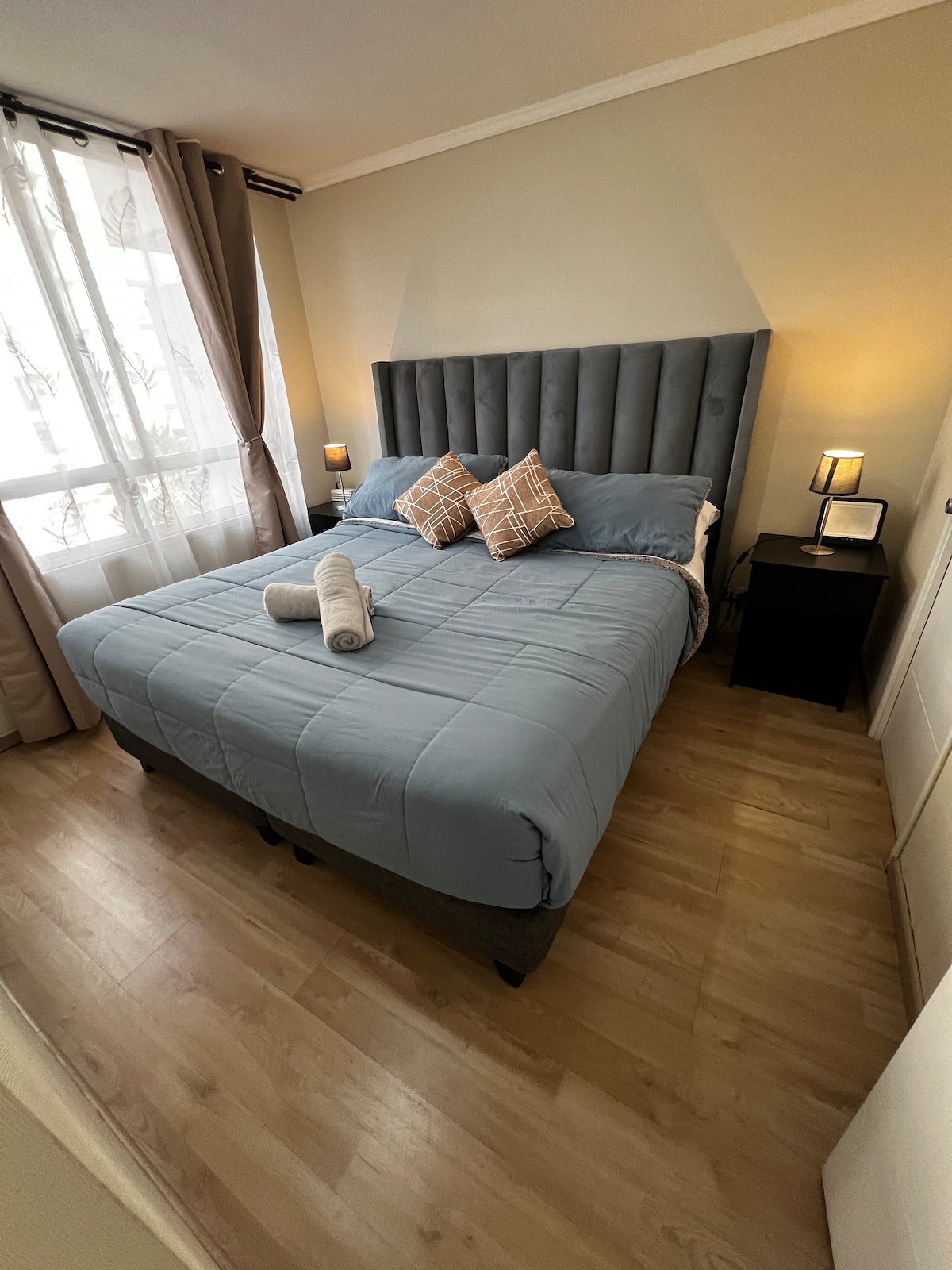 Edificio nuevo, Cercano a metro hospitales, supermercado, con piscina disponible. 1 habitación con cama matrimonial, walking closet y baño. Living comedor con cocina integrada. Sillón cama para 2 personas. Depto en piso 7. A 15 minutos en auto de mall Costanera Center y Parque Arauco, y de Outlets de Quilicura. A 15 min del centro de Stgo, en auto. Incluye estacionamiento en el subterráneo del edificio. Se incluye toallas de baño, secador, sábanas de cama. Ventilador en verano/primavera.