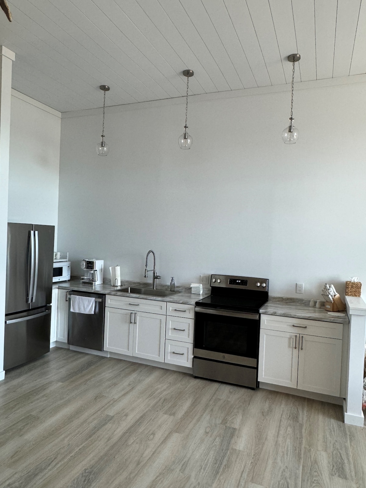 Moderno apartamento tipo estudio en un edificio histórico en Eastport Maine. 460 pies cuadrados con terraza privada, cama tamaño king, sala de estar con estufa de gas, cocina americana y baño. La terraza del segundo piso tiene vistas a un gran patio lateral y cuenta con mesa, sombrilla y sillas para comer fuera o simplemente disfrutar del día. Entrada privada y aparcamiento fuera de la calle. Cocina bien equipada con nevera/congelador, Keurig, hervidor de agua, horno tostador, utensilios de cocina, cuchillos, utensilios y vajilla. Amplio armario con aspiradora y calentador.