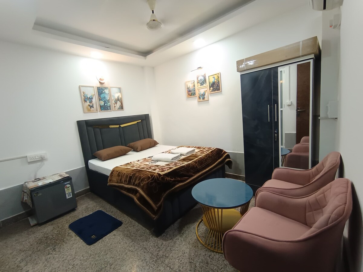 ✨ Cozy Queen – Private 1BHK Stay Enjoy a peaceful and comfortable stay in this well-maintained private 1BHK, perfect for couples, solo travelers, or short city stays. The apartment features a cozy bedroom with fresh linens, air conditioning, a clean private bathroom, and a comfortable seating area. Located in a calm Chhatarpur neighborhood with easy access to South Delhi, cafes, and transport. Ideal for guests looking for privacy, cleanliness, and a relaxed stay.