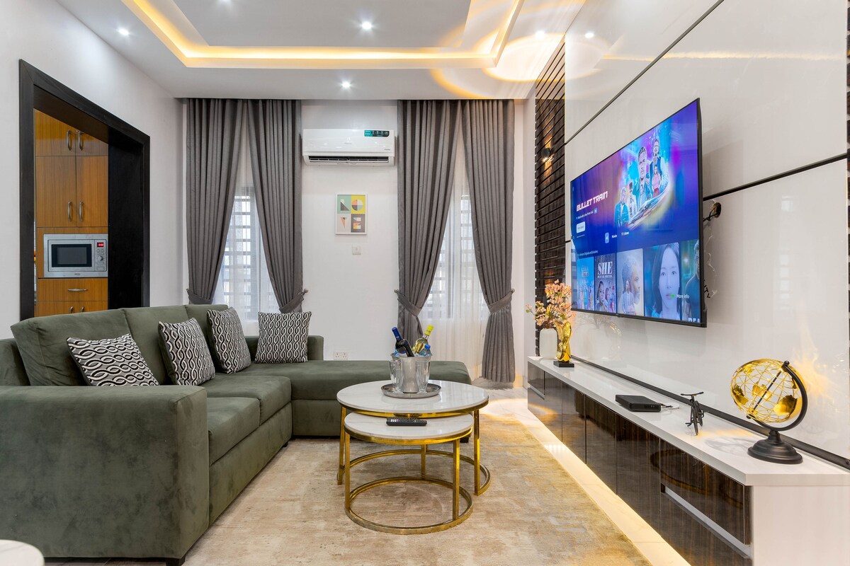 Bienvenido a Elmstead Luxury Aprt, su elegante refugio en Lekki Ikota. Este refugio de 2 dormitorios y 2 baños ofrece comodidad de aire acondicionado, un televisor de 65" en la sala de estar, televisor de 43" en los dormitorios, wifi ilimitado estable y gratuito y energía 24/7 con inversor y energía solar. Disfruta de llegada autónoma con cerradura inteligente, aparcamiento gratuito, lavadora en el alojamiento y un castillo hinchable para niños. 1 limpieza gratuita para estancias de más de 5-6 noches. Cerca del centro de conservación de Lekki, Mega Chicken, Blackbell y Blemco. Perfecto para viajeros solitarios, huéspedes de negocios, familias o estancias largas.