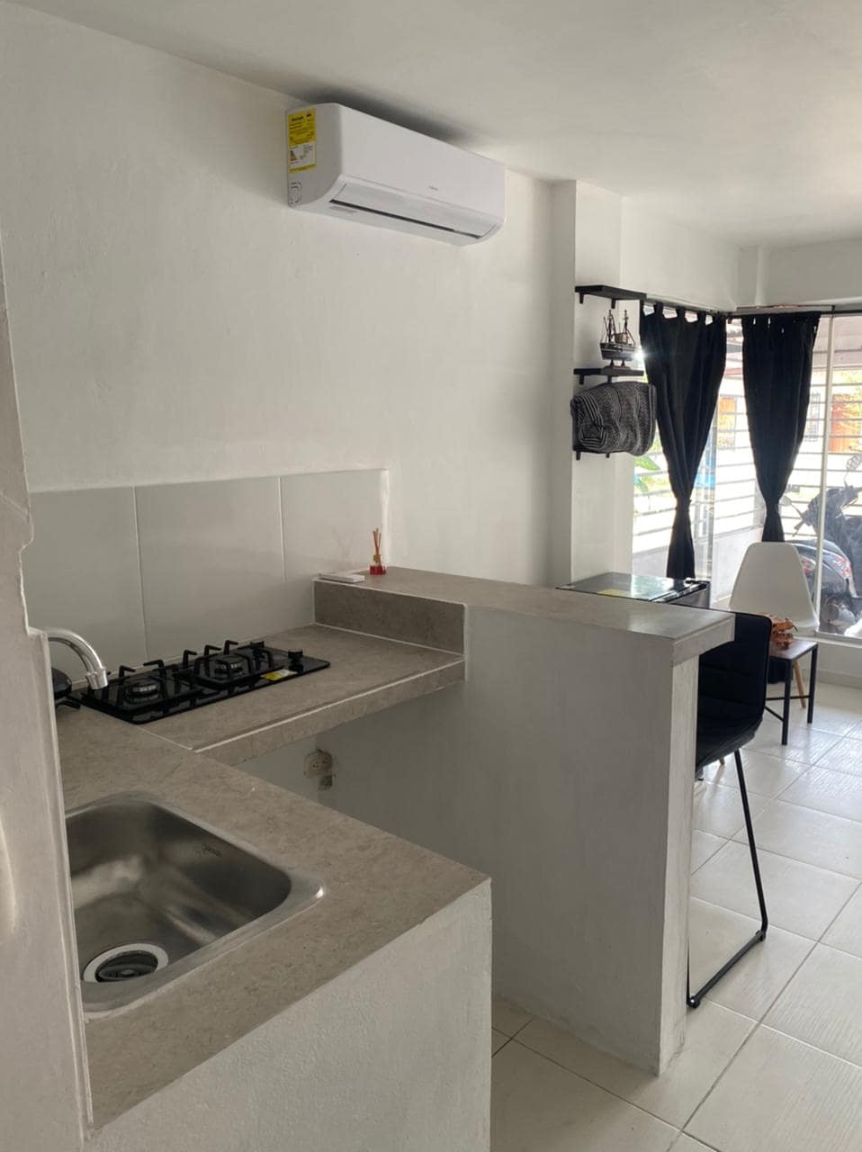 Apartamento para dos personas a menos de 5 minutos del aeropuerto. Incluye: Cama doble o dos camas individuales. A/C, TV, WiFi de alta velocidad. Baño privado. Cuarto de lavado, lavadora, utensilios de limpieza. Cocina con nevera, estufa integral, utensilios de cocina. Sala con mesón para dos personas y zona de descanso con sofá.