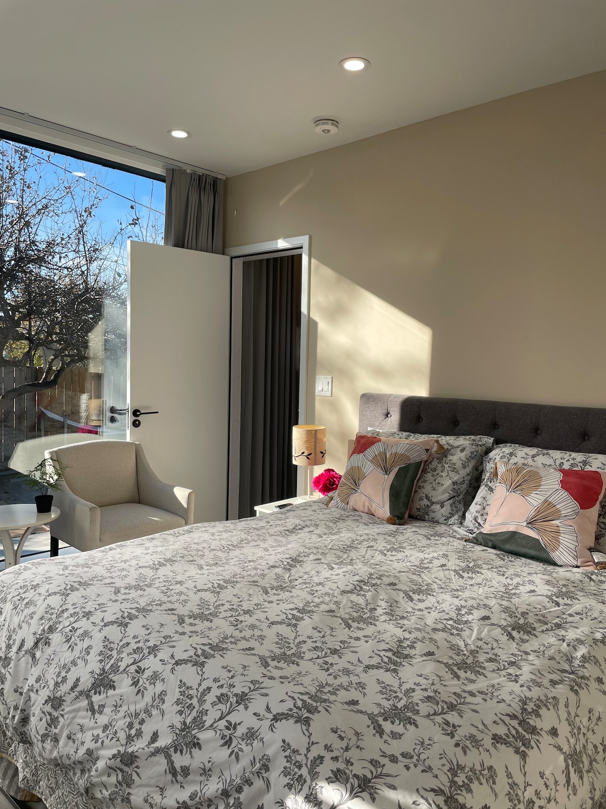 Peaceful bedroom with pool, deck, private entrance