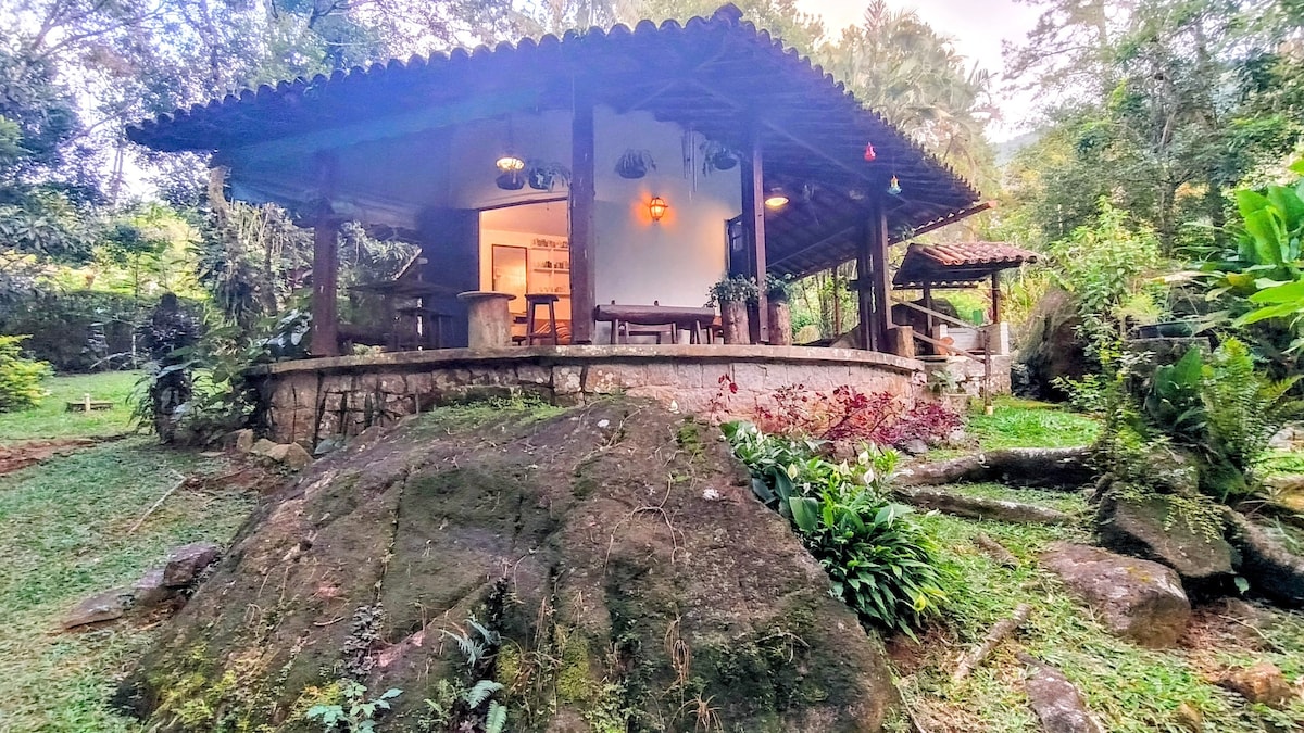 No Refúgio Alambari, a floresta te abraça! Nossa cabana rústica, com paredes de pedra e atmosfera tropical, fica no meio de uma Área de Proteção Ambiental – sem vizinhos, só a Mata Atlântica e sua biodiversidade. Chegar já é uma experiência: uma trilha curtinha (100m) te leva a esse paraíso com ofurô, sauna e deck privativos. Se bater vontade de um mergulho, o Rio Alambari tá logo ali! Um refúgio único pra desconectar do mundo e se reconectar com a você, de um jeito que só a Serrinha consegue!