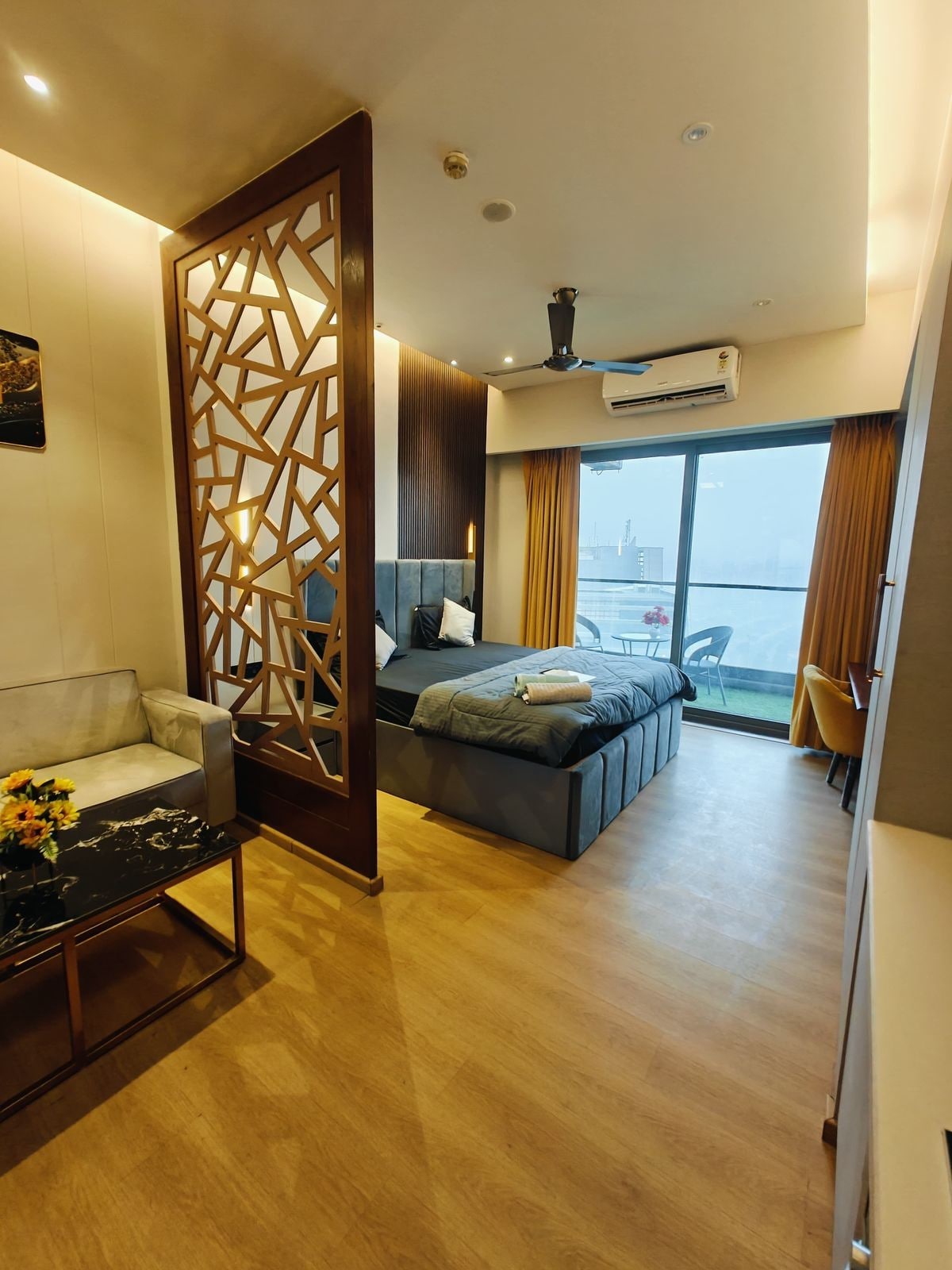 El primer apartamento de 2 Bhk que cumple con todos los requisitos ✨ - 2 dormitorios ( dormitorio principal, segundo dormitorio). - Dos camas tamaño king. - Una amplia sala de estar con una cómoda disposición de asientos. - 2 baños ( 1 en cada uno de los dormitorios). - Cocina pequeña (con todos los utensilios básicos de cocina disponibles y servicios abastecidos, es el lugar perfecto para preparar tus comidas favoritas) - Una zona de balcón compartido que conecta con el apartamento, que puede ser el espacio perfecto para tus paseos nocturnos. ¡Reserva ahora!