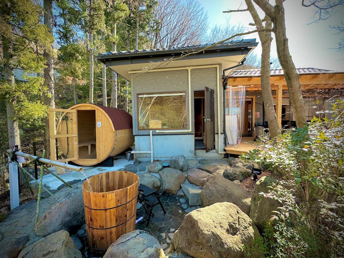 Una villa aislada con una sauna rodeada de naturaleza. Situado a unos 5 minutos en coche de la estación de Hakone-Yumoto, es un refugio tranquilo en el bosque. Cuenta con una sauna de barril con una ventana de media luna, agua fresca de manantial de montaña y relajación bajo el cielo estrellado. Perfecto para los entusiastas de la sauna, con opciones para barbacoas y fogatas. Disfruta de momentos preciosos con seres queridos, ya sean animados o serenos. Experimenta el “silencio” lejos de la ciudad, inmerso en la naturaleza.