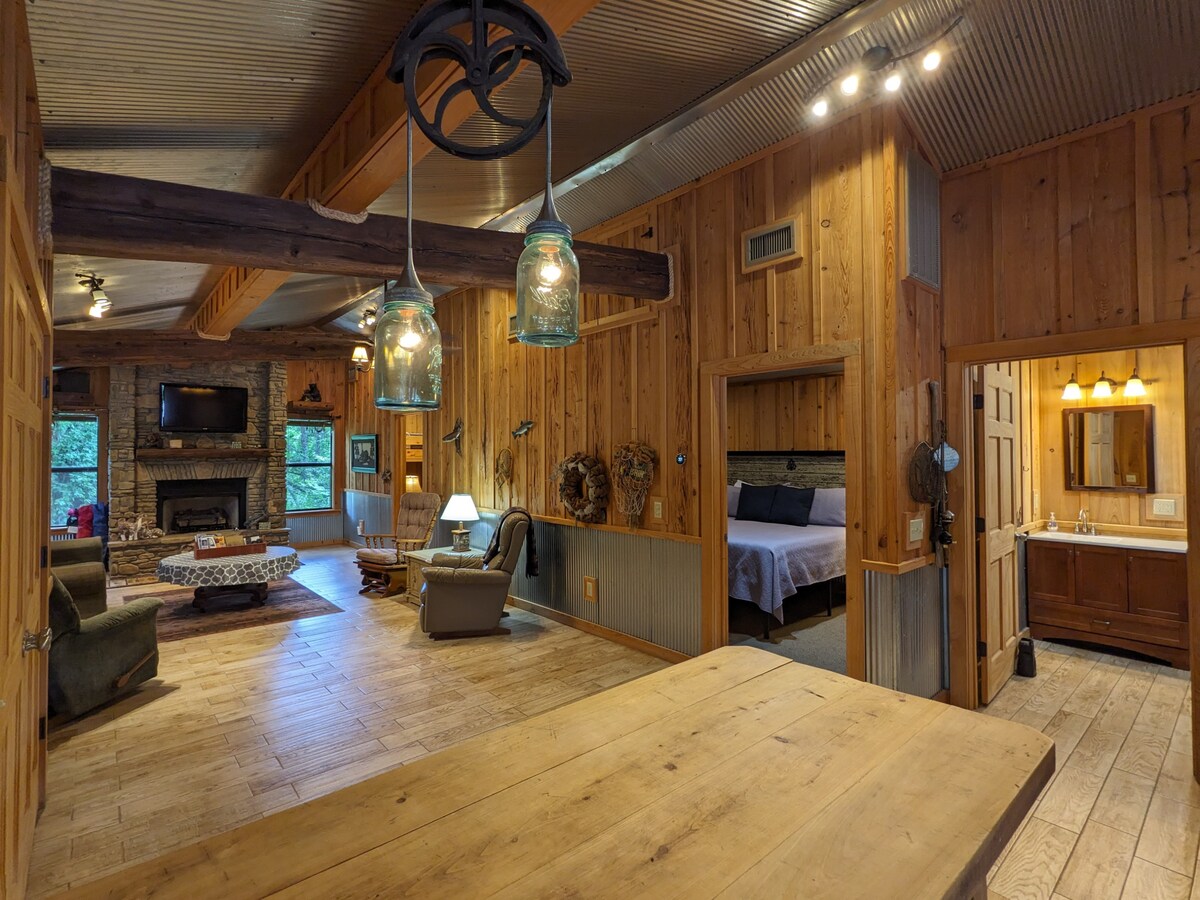 Relájate y desconecta en este alojamiento tranquilo y elegante construido en nuestra hermosa propiedad junto al río White. Todo en esta cabaña fuera de la red fue hecho a mano con madera y suministros de origen local. Nosotros mismos molimos toda la madera de nogal que tan bellamente transforma este espacio. Ubicado a solo 8 millas de la ciudad de Mountain View, donde puedes participar en nuestros muchos festivales locales, escuchar música o simplemente echar un vistazo a las hermosas montañas Ozark.