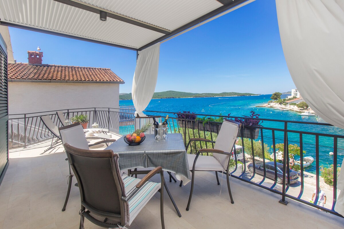 The apartment is located in the center of Žaborić, 12 km from Šibenik. Indoors 62m2 + 14m2 terrace. The distance from the sea is 40m and from the beach 60m. In the vicinity there are restaurants (50m away), cafes (30m away) and a childrens playground (40m). The apartment is on the first floor of the house. It consists of two bedrooms, a kitchen+dining room, a bathroom and a living room connected to a spacious terrace with a view of the garden, the sea, and the islands. Welcome to our apartment