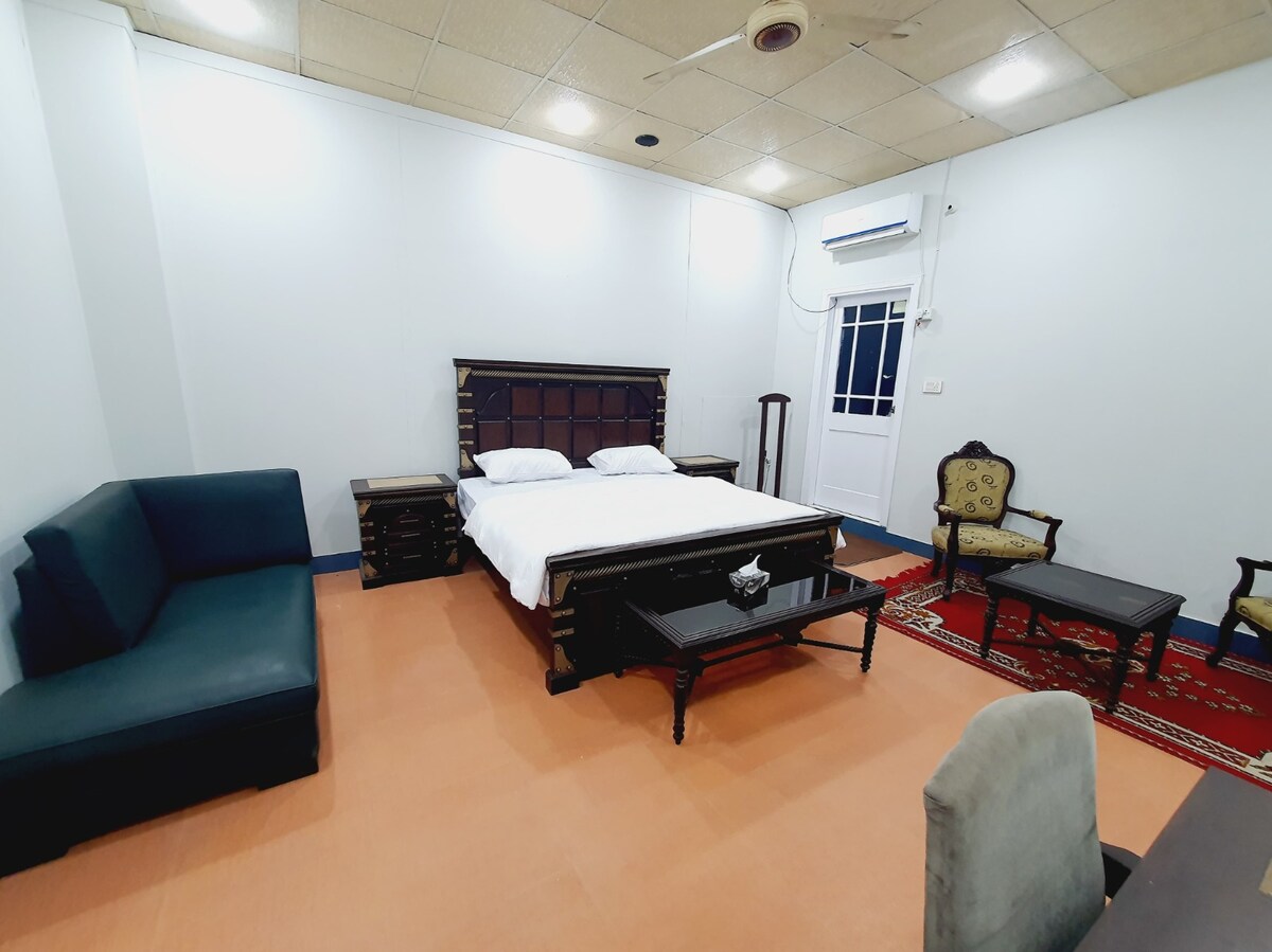 Situada a 5 km del aeropuerto de Sialkot, en el corazón de Sambrial, esta casa de huéspedes familiar es el lugar perfecto y seguro para familias y viajeros por igual. Cuenta con un aparcamiento seguro y privado con presencia de guardia de seguridad las 24 horas. La mezquita, los restaurantes, las panaderías y las farmacias están a 2 minutos a pie. Cuenta con un dormitorio tamaño king y un sofá cama.