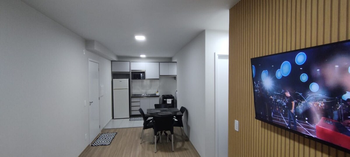 Retiro de🌴 playa en Gleba Palhano ✨ Un toque de lujo con un ambiente playero para tu estancia 🛌 Suite con aire acondicionado, cortina opaca y ropa de cama 🖥️ Habitaciones decoradas: TV inteligente y ventilador de techo Internet 📶 de alta velocidad Garaje 🅿️ privado 👮 Recepción 24/7 🏊 Piscina, gimnasio, sala de juegos, espacio de coworking, lavandería compartida y tienda de comestibles 🐾 ¡Aceptamos mascotas! Se permite 1 mascota pequeña por estancia. 📍 Ubicación privilegiada A ✔ 300 metros del centro comercial Aurora A ✔ 500 m del lago Igapó
