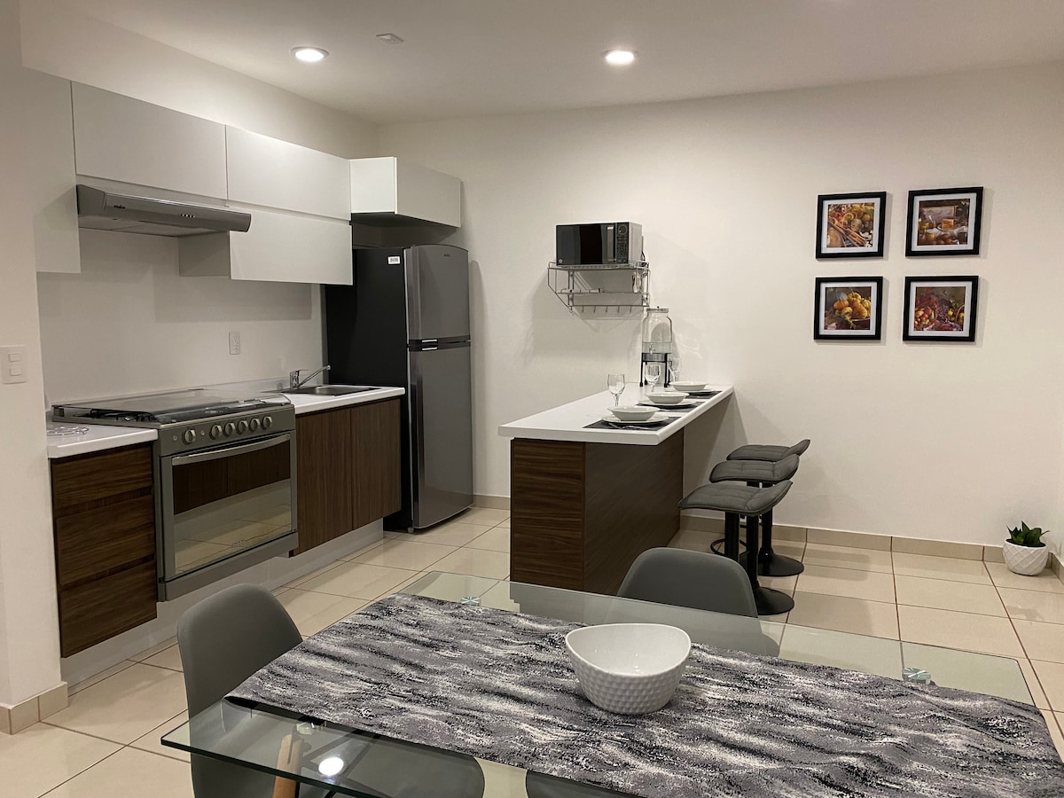 Relájate en esta escapada única! disfruta de este cálido y excepcional espacio, diseñado para que disfrutes tu estadía en la cuidad, con estilo y la comodidad de tener todos los servicios cerca; como hospitales, escuelas, centros comerciales, trota pista, restaurantes y espacios recreativos dentro de las instalaciones como alberca, roof garden y gimnasio, así como estacionamiento cubierto y elevador que harán de tu estancia, toda una experiencia placentera sea cual sea el motivo de tu visita.