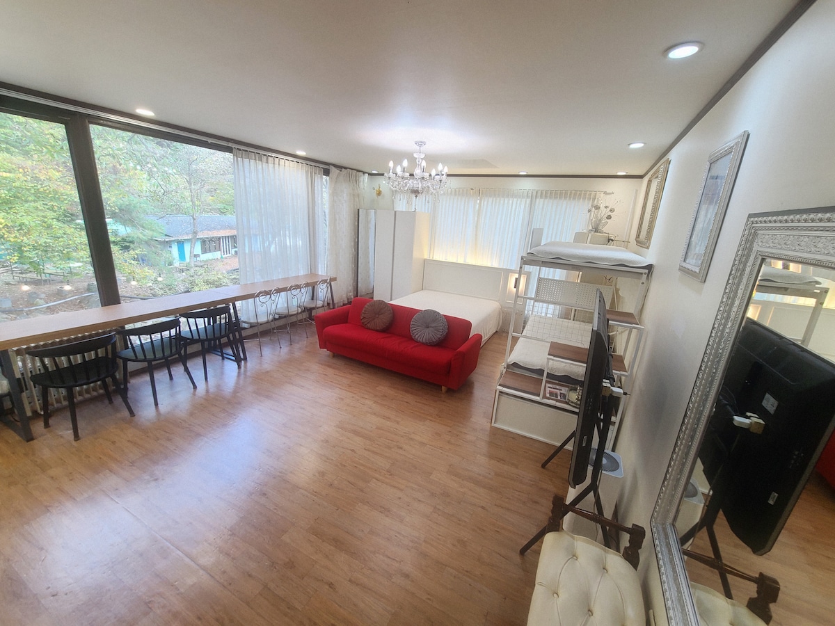 Spacious private retreat nestled in the serene nature of Gapyeong, offering the perfect setting for unforgettable moments. You’ll wake to warm sunlight and end your day beneath a sky overflowing with stars. With over 165 square meters of indoor space and over 1,300 square meters outdoors, is perfectly suited for family getaways, gatherings with friends, and workshops. Thoughtfully designed amenities and warm hospitality await, making your time with loved ones even more meaningful and enjoyable.