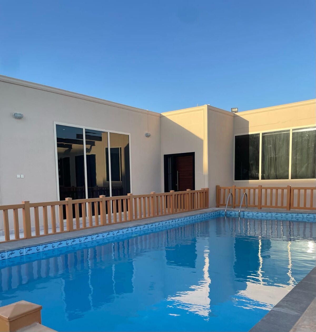 Espero que tengas buenos recuerdos con amigos y familiares (Todos estos en el área al aire libre no en el edificio principal) 1 sala de estar grande + mesa de comedor 6 asientos (cocina de servicio) solo microondas y calentador de agua y nevera pequeña Smart TV para ver películas 1 habitación con cama. 2 baños 2 asientos al aire libre en diferentes ubicaciones Piscina kayak gratis Puedes nadar en la piscina o en el mar Hay un seguro adicional de 500 SAR