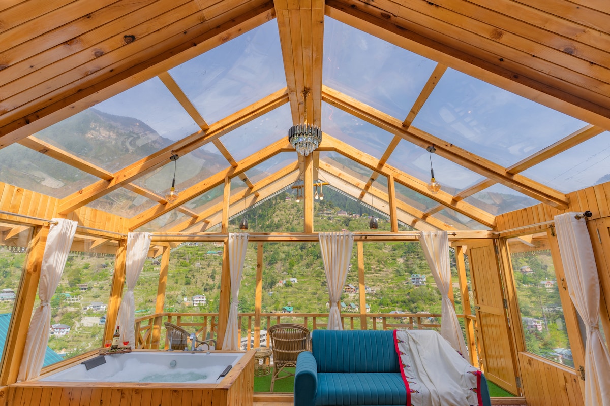 Experience the perfect blend of nature and opulence, perched atop Tandi hill near Jibhi. Delight in a luxurious soak in a hot bubble bath while relishing breathtaking views directly from your bathtub. Nestled away from road and traffic noise, the only sounds you'll encounter are the melodic chirping of birds. With an all-glass cabin, you might even spot a flying squirrel or catch a glimpse of a shooting star in serene night sky. Unwind and enjoy the tranquility of this chic, peaceful retreat.