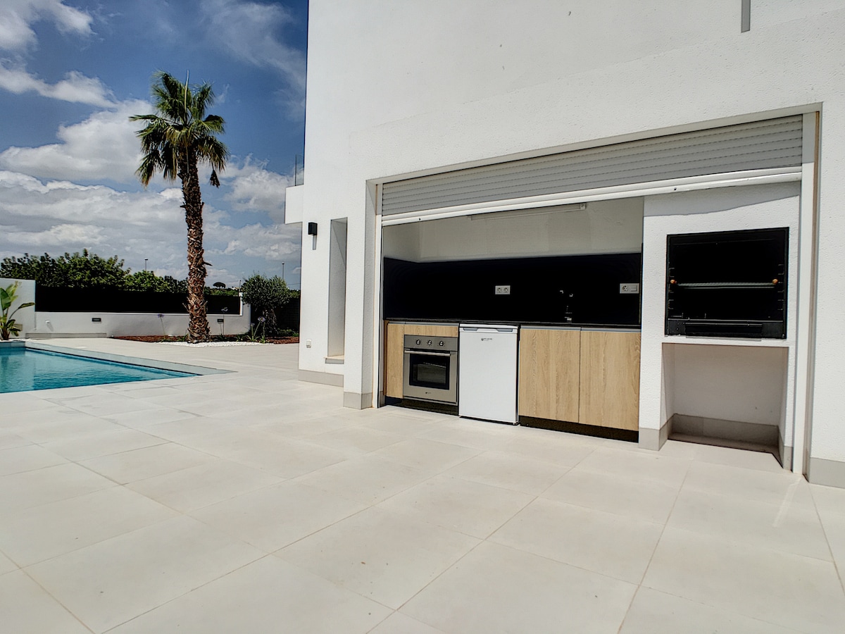 Golf, strand, barer, restauranter, storby eller rolig avslapping. Ta med familien eller venner og nyt dette elegante bostedet. Den helt nye luksuriøse villaen har en rekke fasiliteter. Privat hage og bassengområde med ulike sitteplasser, solsenger og grill, perfekt for avslapning utendørs. Du kan boltre deg over tre etasjer med en stor takterrasse hvor du kan nyte utsikten mot byen og mot havet. Aircondition og raskt internett. Vi tilbyr 3 dobbeltsenger 160*200 og 4 enkeltsenger 90*200.