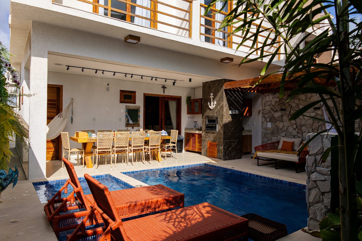 @ankhjeri Una casa privada que combina comodidad, naturaleza y exclusividad. Frente al mar y junto a la Serra do Serrote. Con 4 baños (3 camas dobles + 2 camas individuales convertibles en dobles). Tiene un salón con una cortina de cristal y una increíble azotea con vistas al mar. Todos los alojamientos tienen aire acondicionado, wifi, televisión por cable, Netflix y caja fuerte. Zona común: piscina, jardín y barbacoa compartida. Ubicado a solo 2 manzanas del centro del pueblo