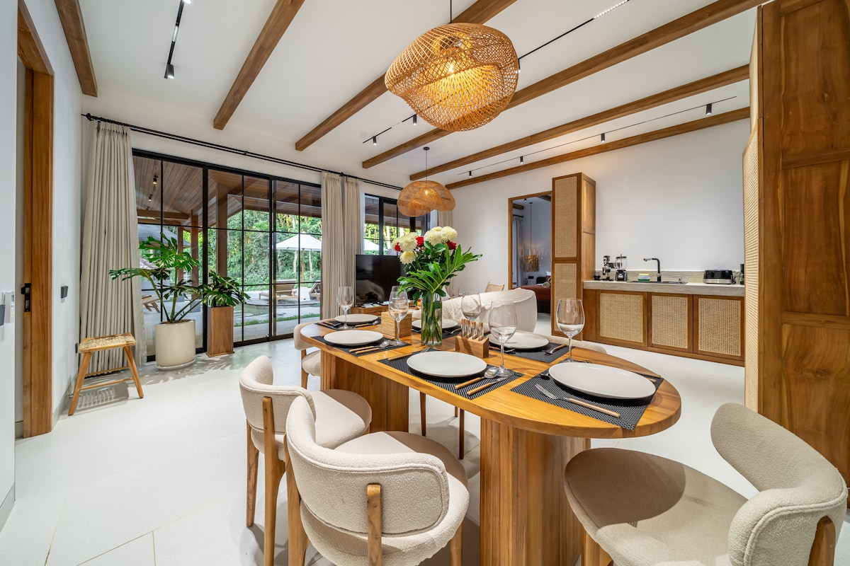 Villa nueva en una ubicación privilegiada de Ubud: • 3 elegantes dormitorios con aire acondicionado y vistas al jardín • 3,5 baños con artículos de tocador, zapatillas y secadores de pelo (2 incluyen bañeras) • Cocina y comedor totalmente equipados. • Amplio patio, exuberante jardín tropical y gran piscina privada • Escritorio, caja fuerte y plancha • Wifi de 300 Mbps • Limpieza diaria con toallas y sábanas frescas • Cuna y trona bajo petición • Servicios de conserjería para alquiler de escúteres, excursiones y más • PS5, Netflix a petición