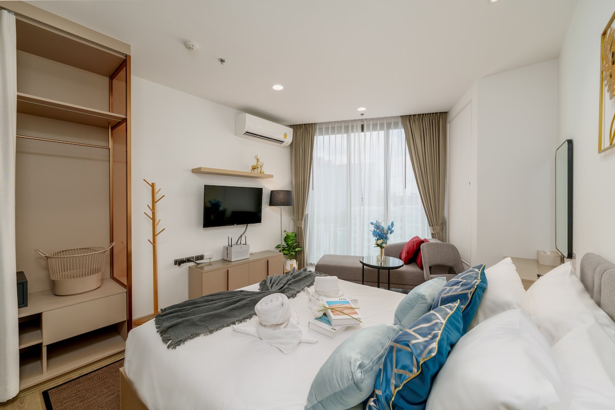 Amplio y acogedor apartamento moderno de 2 dormitorios a solo 300 metros de la playa. Sala de estar de 50 metros cuadrados con sistema de cine en casa. Cocina moderna equipada con lavavajillas, 5 balcones con vistas al mar, uno de ellos es una terraza de 25 metros cuadrados con una fantástica vista al mar. Internet de fibra óptica de 500/500 Mbit incluido. La electricidad, el agua y Netflix también están incluidos. El precio por noche se establece en baht tailandés, para evitar una pequeña tarifa adicional, elige THB en Airbnb como moneda antes de reservar.