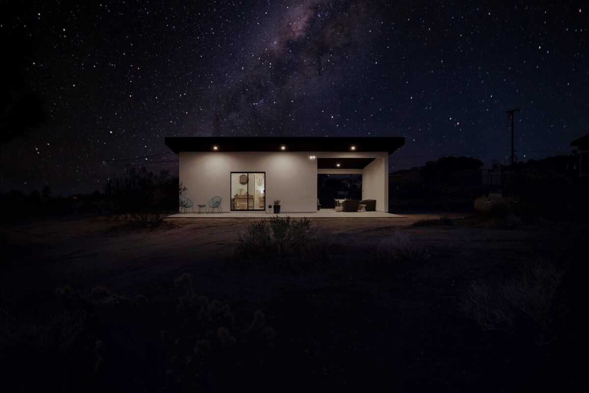 Ubicada en la cima de la Mesa, esta casa de nueva construcción en 10 acres de tierra ofrece vistas al Parque Nacional durante el día y destaca la vasta Vía Láctea por la noche. Sumérgete en la bañera doble con patas de garra y contempla un mar de árboles de Josué o admira el cielo del desierto en el porche trasero mientras las estrellas fugaces se elevan sobre tu cabeza. Si buscas una escapada lejos de las multitudes, pero aún cerca de toda la «diversión» que Joshua Tree y Yucca Valley tienen para ofrecer, no busques más allá de Ladera House.
