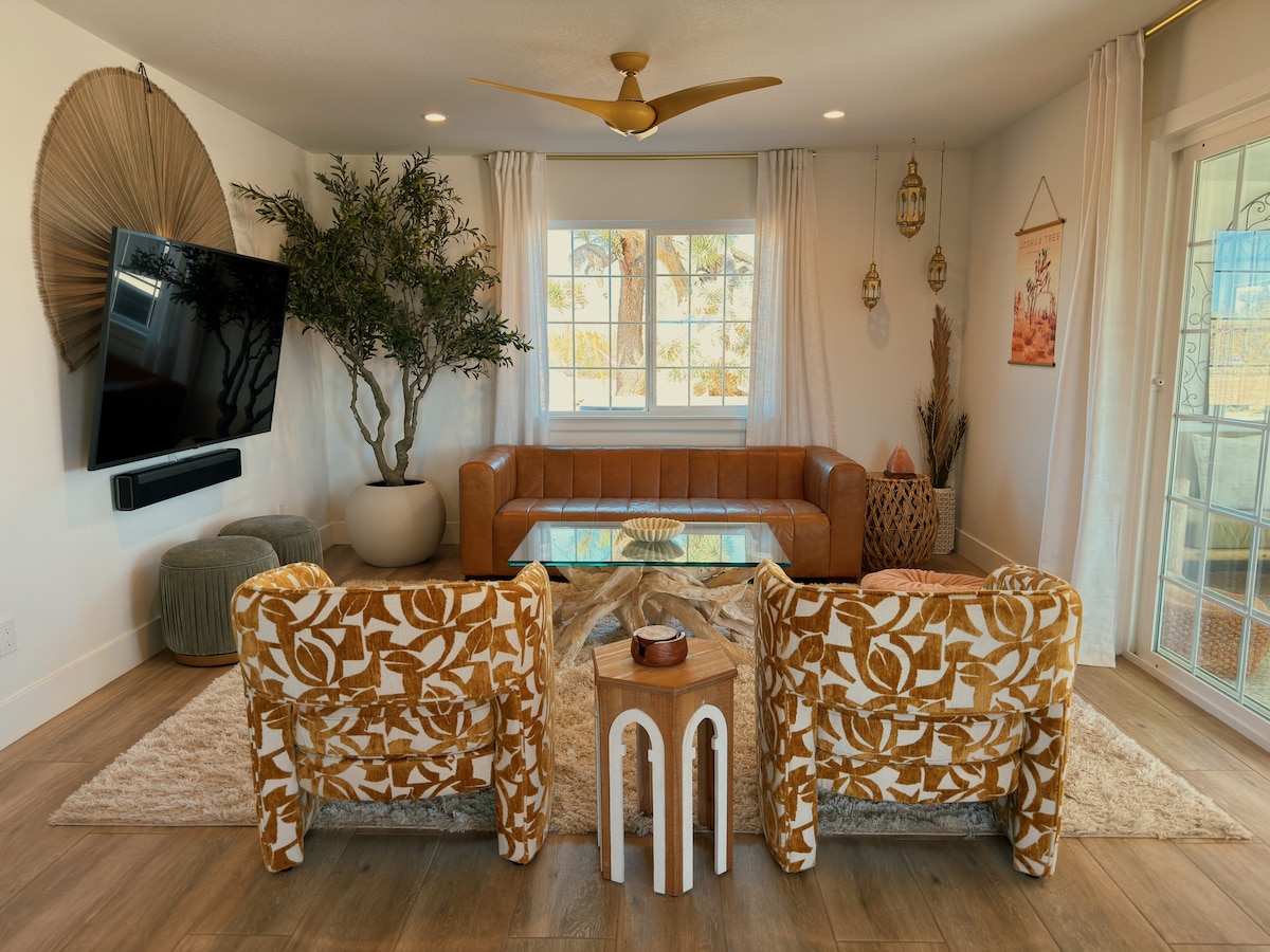 Escápate a Dreamcatcher Hideaway, un elegante bungalow de 2 dormitorios y 2 baños en el corazón del centro de Joshua Tree. A solo media milla de vibrantes tiendas, restaurantes y cafés, y a solo 5 millas de la entrada oeste del Parque Nacional Joshua Tree, este moderno refugio combina la serenidad del desierto con la comodidad urbana. Relájate en una casa llena de luz con cocina gourmet, cine en casa, jacuzzi, bañeras de inmersión, comedor al aire libre, parrilla de propano, chimenea, hamaca y un cargador para vehículos eléctricos de nivel 2.