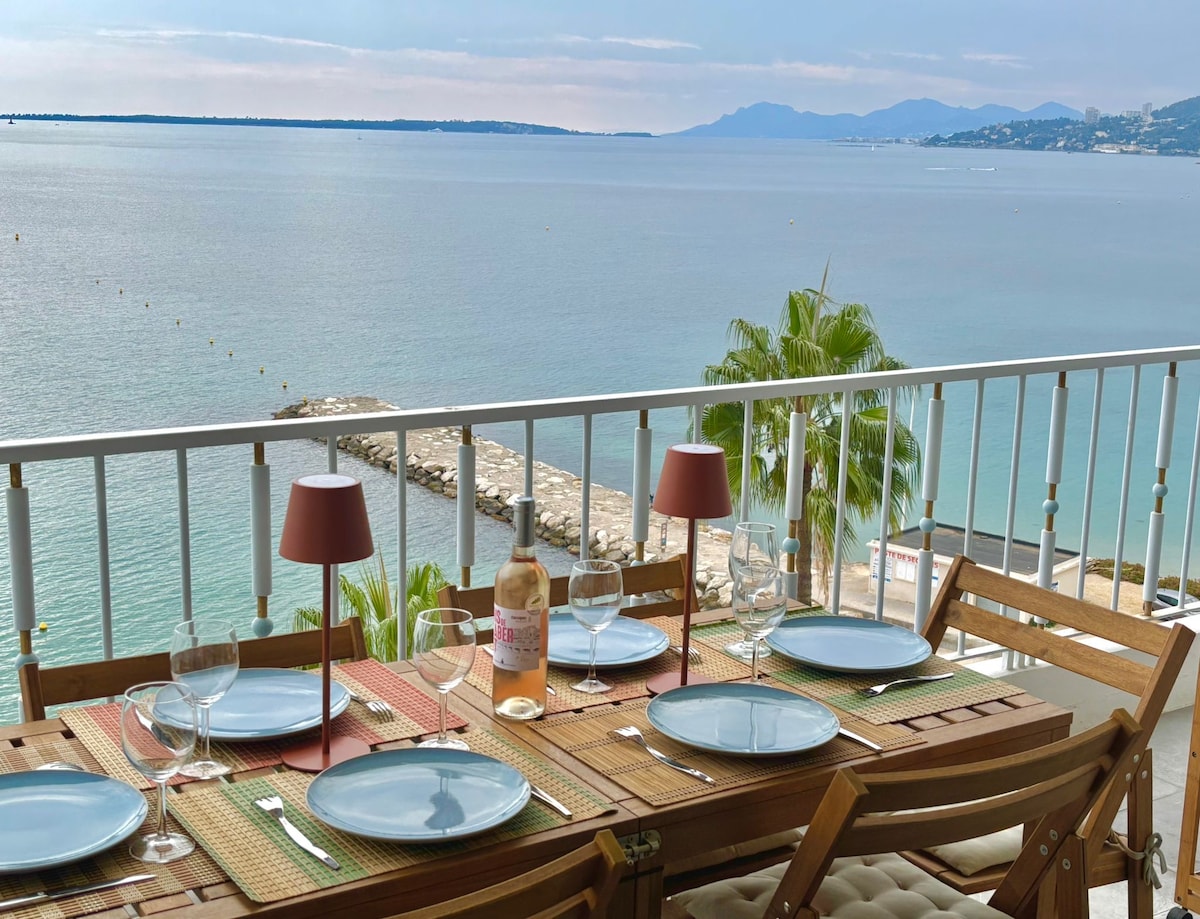 Alojamiento turístico amueblado clasificado de 3 estrellas, séptimo y último piso, frente al mar, luminoso 52 m² con terraza de 25 m² con vista a las islas Lérins. Apertura a la terraza: un dormitorio grande con 1 cama de 160, una sala de estar con sofá cama de 140. Disponible: cama para bebés de hasta 3 años con sábanas, asiento elevador, cochecito. Cocina equipada, baño con ducha a ras de suelo, aire acondicionado. Caja cerrada para vehículo mediano (máximo 1,70). → Se proporcionan: toallas, sábanas, jabón, champú, toalla de papel.
