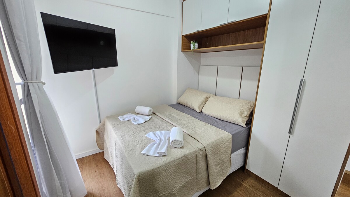 Apartamento super confortável tipo studio com localização imbatível para seus compromissos de trabalho e/ou lazer. ► Cama de casal com colchão de molas; ► Smart Tv 40” (incluso Netflix, Prime Video, Disney+ e Globoplay); ► Ar-condicionado; ► Ventilador turbo; ► Persiana tipo blackout; ► Roupeiro com cabides; ► Caixinha de som bluetooth; ► Mesa de estudos/trabalho com luminária; ► Sofá-cama para casal; ► Mesa para alimentação; ► Cozinha equipada para preparar pequenas refeições.