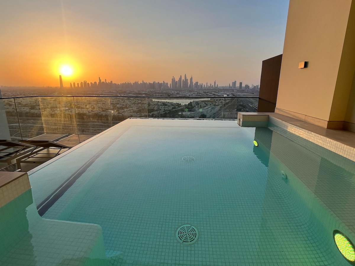 Disfruta de una estancia prémium en este elegante departamento de 1 dormitorio con piscina privada en el balcón y vistas al horizonte desde el piso 30. Los interiores neutros y suaves crean un ambiente tranquilo y lujoso para mañanas relajantes y noches acogedoras. Las comodidades completas incluyen piscina, gimnasio, sauna, baño turco y estacionamiento. Ubicado en JVC con gran acceso a las principales atracciones de Dubai. Ideal para parejas, viajeros solos y huéspedes de negocios que buscan comodidad, privacidad y una experiencia única.