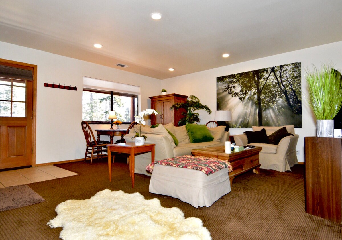 Apartamento renovado en la ciudad a poca distancia a pie de muchas tiendas y restaurantes. Garaje privado (6'8" de altura) con mucho espacio de almacenamiento para bicicletas y esquís y carga gratuita de nivel 2 para vehículos eléctricos (toma NEMA 14-50). La parada de autobús urbano gratuito está a pocos pasos y ofrece un fácil acceso a la montaña y a la ciudad. Nos encanta nuestra ciudad de montaña y estamos dispuestos a ofrecer recomendaciones para actividades divertidas durante toda la temporada. *Aire acondicionado portátil solo en el dormitorio; se proporcionan ventiladores para otras habitaciones durante el verano*