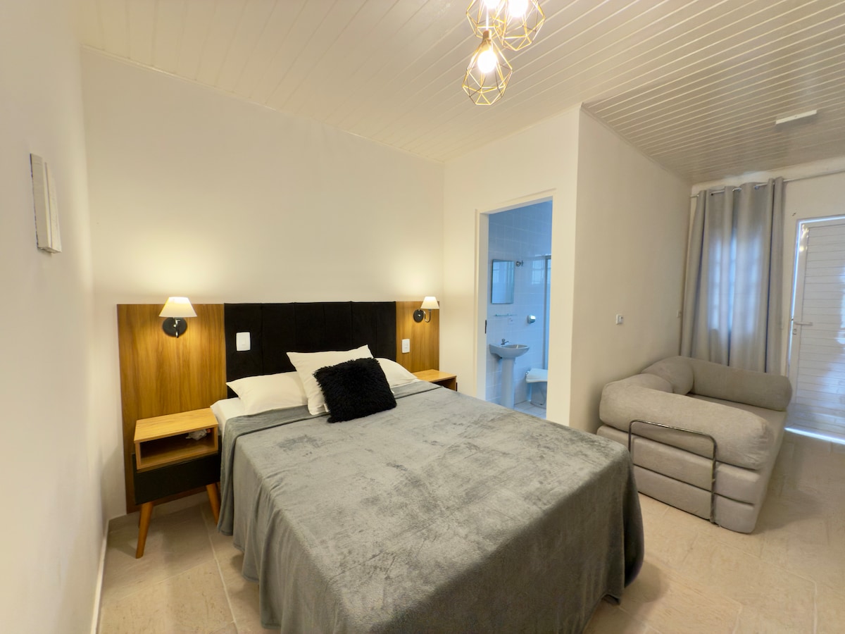 The room sleeps up to three people. Located in a strategic point on Juquehy beach on the north coast of São Paulo. The room is fully equipped. Includes bed linen, towels, cups, plates, glasses, air conditioning, microwave and hairdryer. External area with sink and armchairs for rest. Covered parking. Close to supermarket, pharmacy, malls, restaurants, bakeries and gym. There are 950 meters from the beach. Come to enjoa Juquehy.