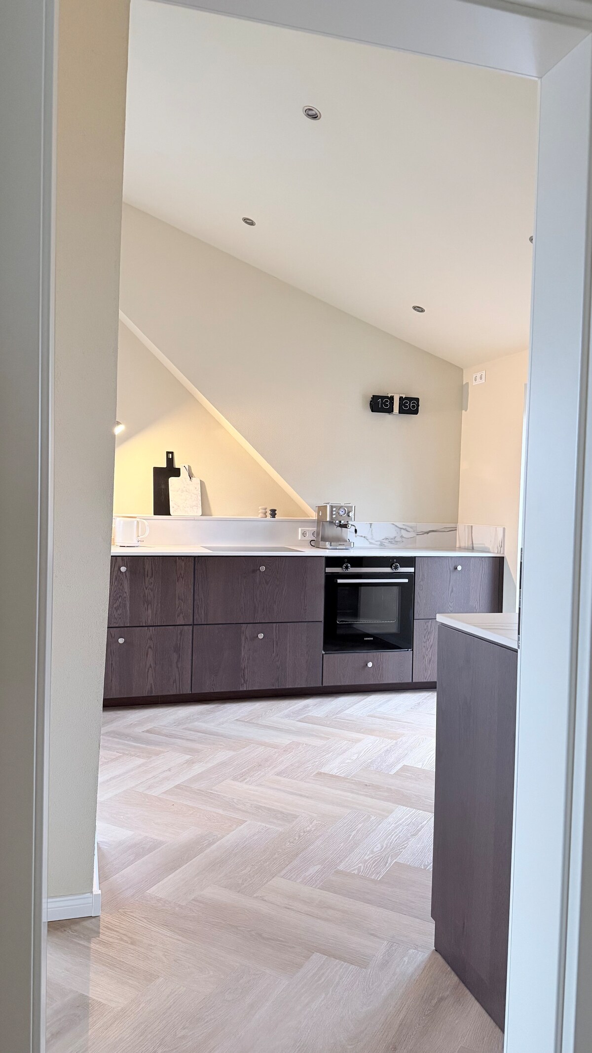 Disfruta de espacio para hasta 4 personas en la planta superior de unos 70 m²: dos dormitorios con cómodas camas dobles, una impresionante altura de techo de 5,20 m y una fachada acristalada con vistas panorámicas de Fulda, Frauenberg y el Rhön. La cocina totalmente equipada, una acogedora sala de estar con televisor inteligente de 65" y un lujoso baño con ducha de lluvia garantizan la comodidad. Relájate en el balcón cubierto o en la sauna. Con fotovoltaica, plaza de aparcamiento y estación de carga de bicicletas eléctricas.