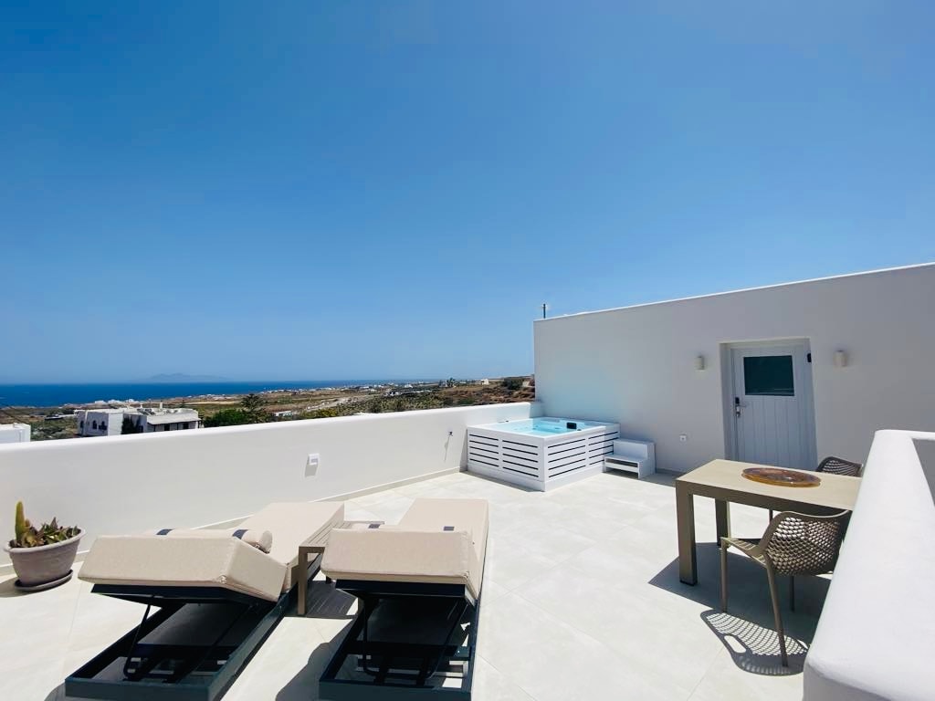 Santoneta Luxury Caves se encuentra en el lado este de la isla, no en el lado de la caldera, en una zona tranquila. A través de la piscina infinita privada se puede disfrutar de la vista sin obstáculos del mar y de la hermosa isla de Anafi. Se encuentra a 1,5 km de Imerovigli y a 6 km de Fira. Te recomiendo un vehículo para el resto de tu estancia, porque no hay parada de autobús y la carretera es un poco cuesta arriba. Imerogivli, Fira y Oia están muy cerca de cualquier vehículo, también puedo recomendarte un conductor para tu transporte.